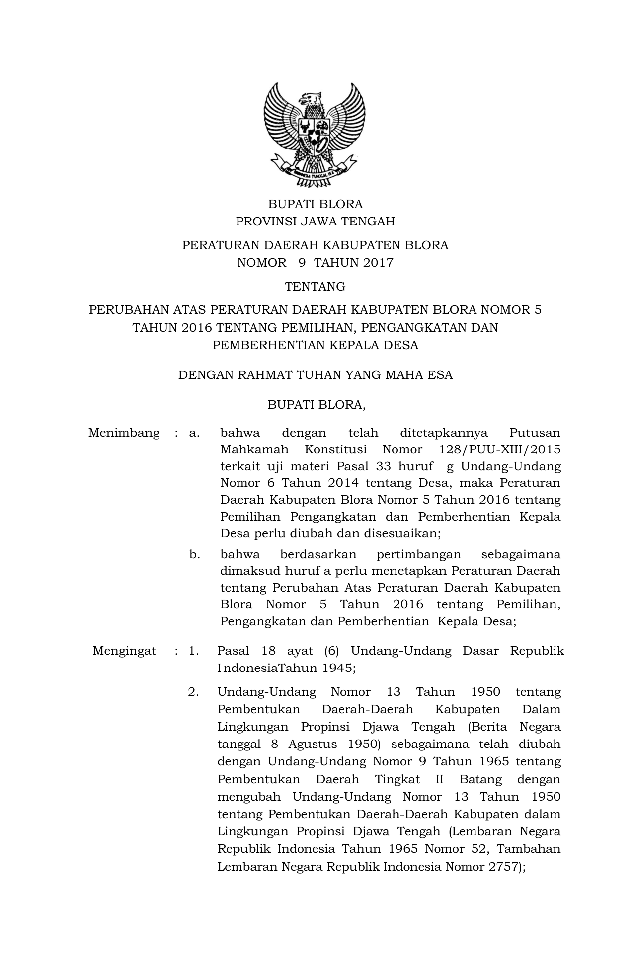 PERDA Nomor 9 Tahun 2016 | Peraturan Daerah Nomor 9 Tahun 2016 tentang Perubahan Atas Perda Kab. Blora Nomor 5 Th 2016 tentang Pemilihan, Pengangkatan dan Pemberhentian Kepala Desa