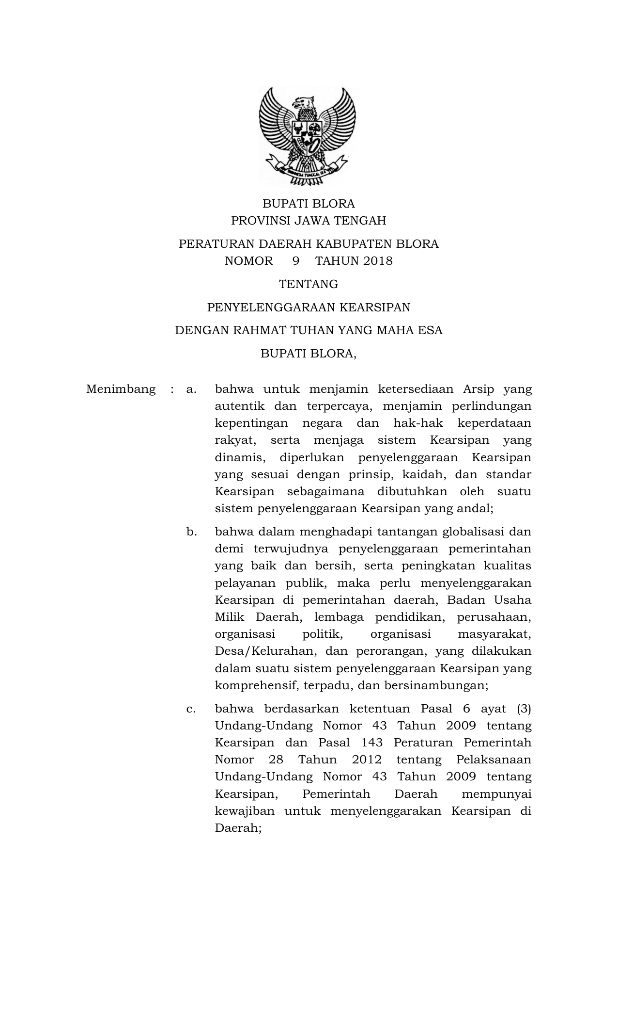 PERDA Nomor 9 Tahun 2018 | Peraturan Daerah Nomor 9 Tahun 2018 tentang Penyelenggaraan Kearsipan