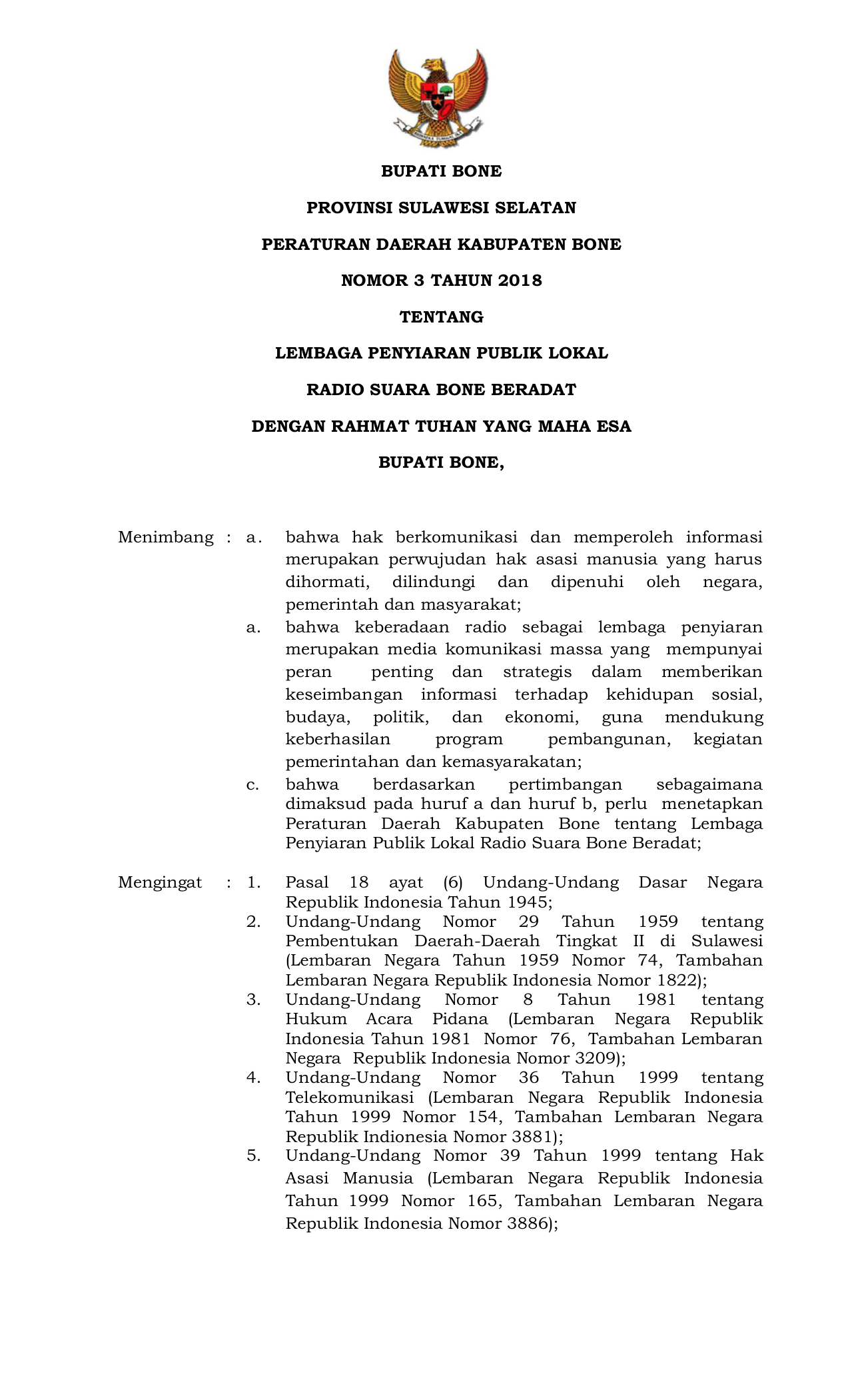 PERDA Nomor 3 Tahun 2018 | Peraturan Daerah Nomor 3 Tahun 2018 tentang LEMBAGA PENYIARAN PUBLIK LOKAL RADIO SUARA BONE BERADAT