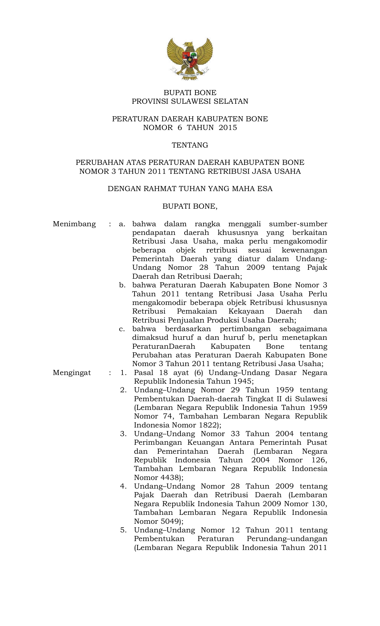 PERDA Nomor 6 Tahun 2015 | Peraturan Daerah Nomor 6 Tahun 2015 tentang PERUBAHAN ATAS PERATURAN DAERAH KABUPATEN BONE NOMOR 3 TAHUN 2011 TENTANG RETRIBUSI JASA USAHA
