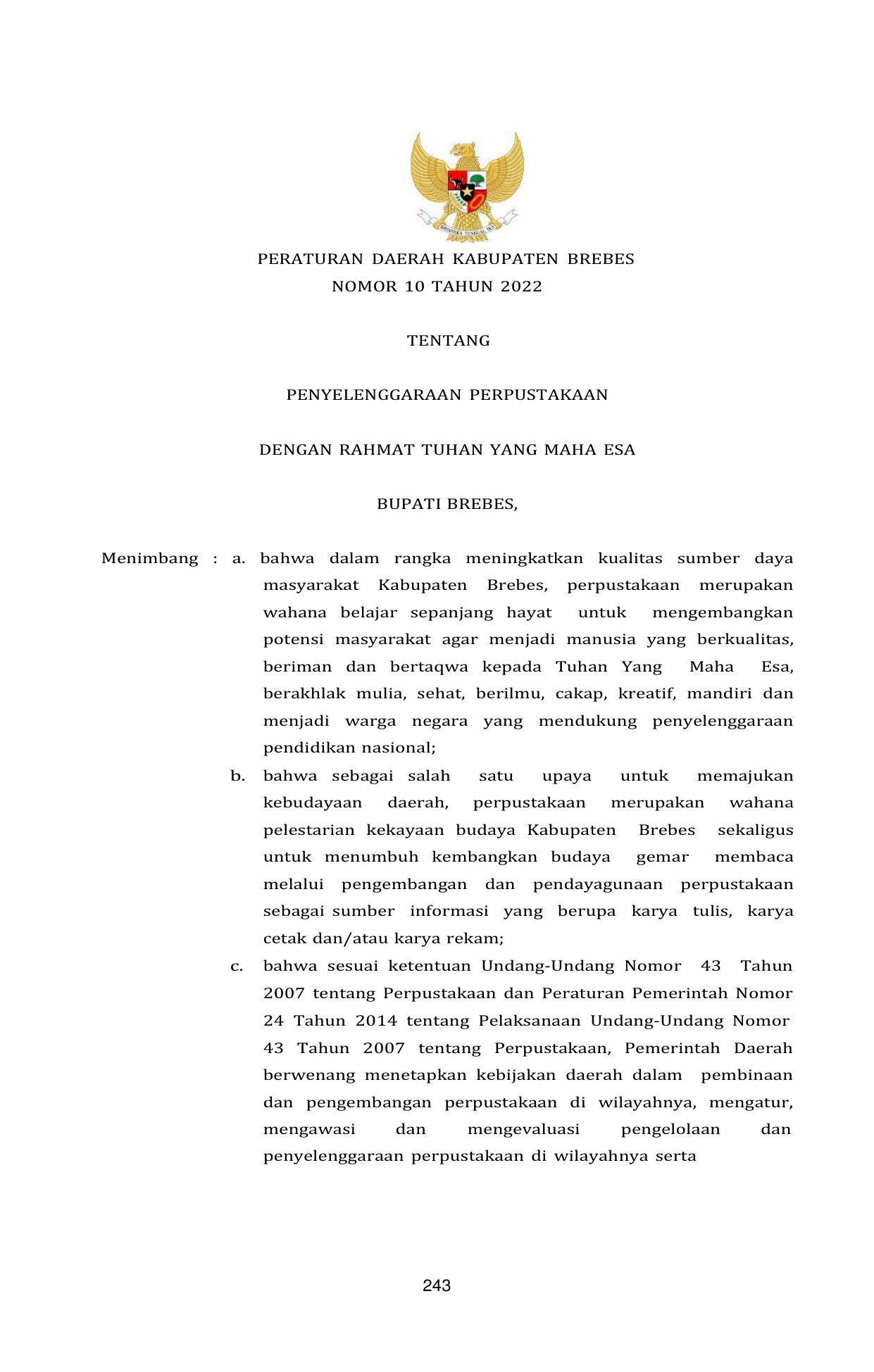 PERDA Nomor 10 Tahun 2022 | Peraturan Daerah Nomor 10 Tahun 2022 tentang PENYELENGGARAAN PERPUSTAKAAN