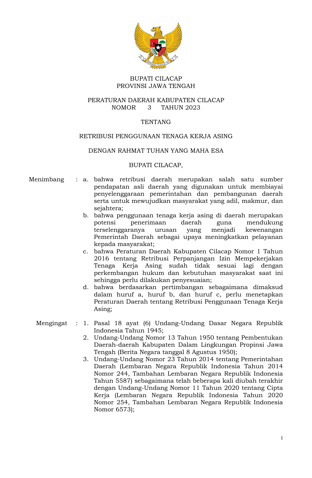 PERDA Nomor 3 Tahun 2023 | Peraturan Daerah Nomor 3 Tahun 2023 tentang Retribusi Penggunaan Tenaga Kerja Asing