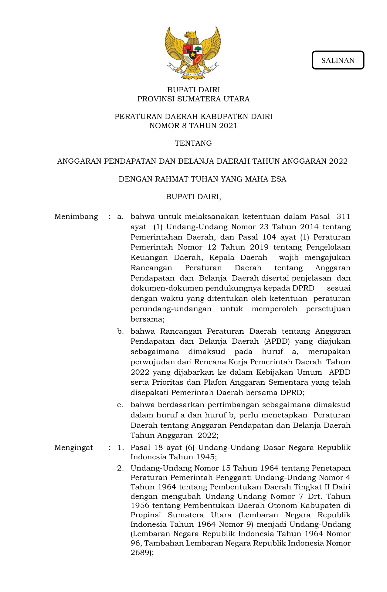 PERDA Nomor 8 Tahun 2021 | Peraturan Daerah Nomor 8 Tahun 2021 tentang ANGGARAN PENDAPATAN DAN BELANJA DAERAH TAHUN ANGGARAN 2022