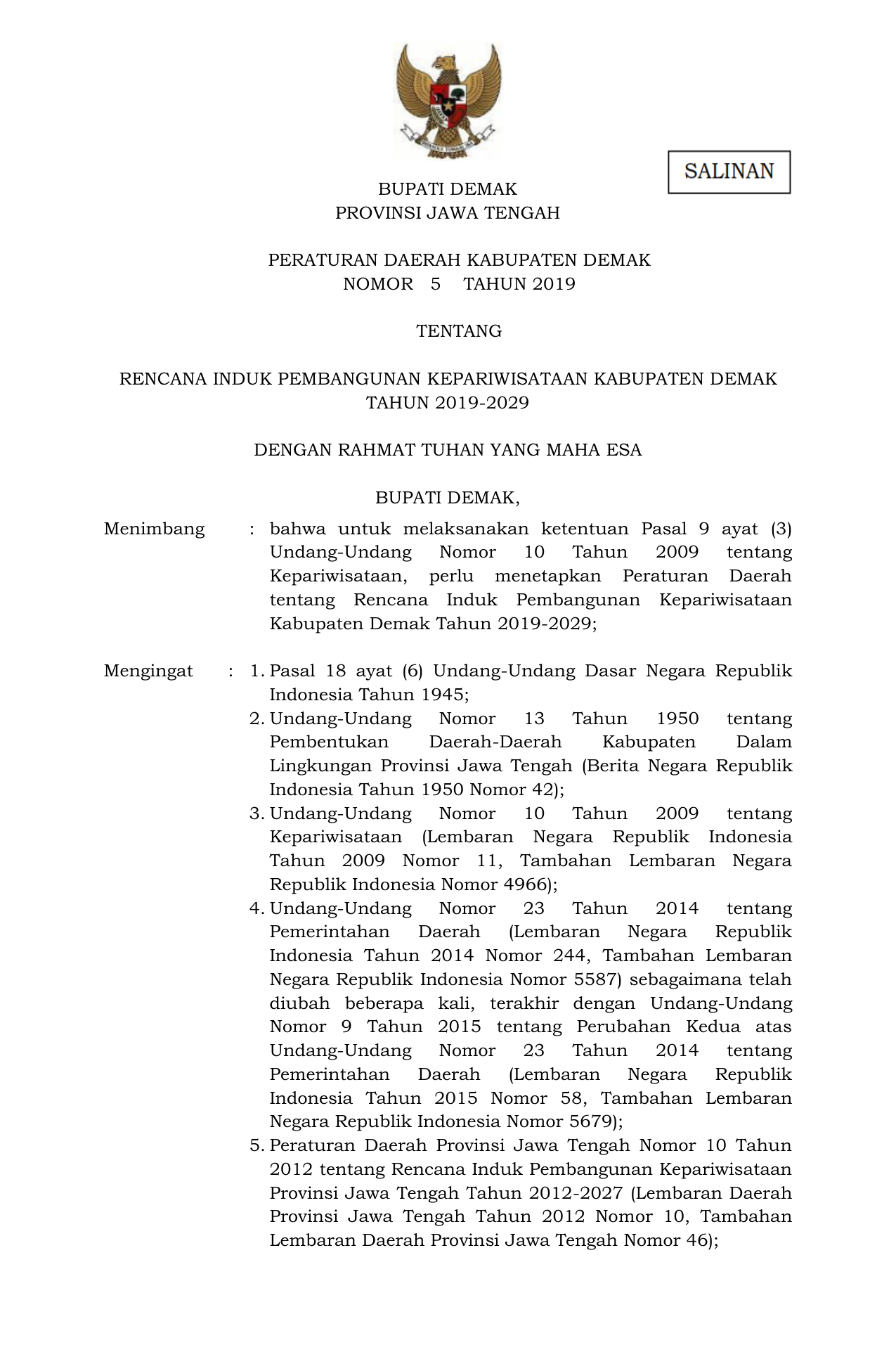 PERDA Nomor 5 Tahun 2019 | Peraturan Daerah Nomor 5 Tahun 2019 tentang Rencana Induk Pembangunan Kepariwisataan Kabupaten Demak Tahun 2019-2029