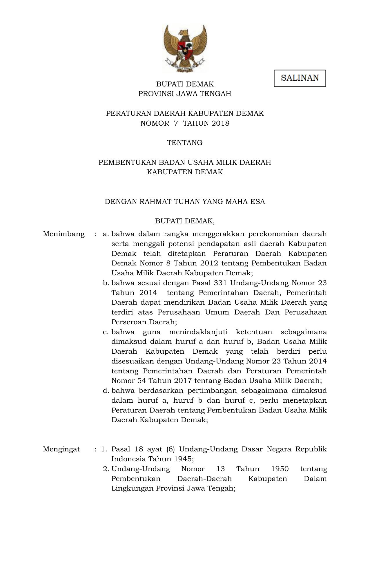 PERDA Nomor 7 Tahun 2018 | Peraturan Daerah Nomor 7 Tahun 2018 tentang Pembentukan Badan Usaha Milik Daerah Kabupaten Demak