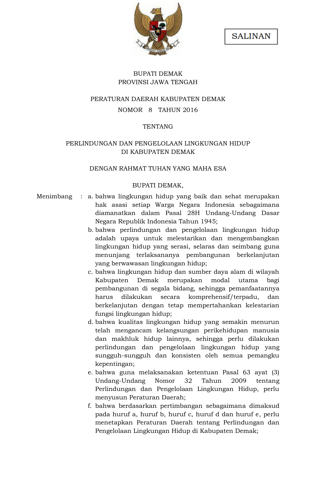 PERDA Nomor 8 Tahun 2016 | Peraturan Daerah Nomor 8 Tahun 2016 tentang Perlindungan dan Pengelolaan Lingkungan Hidup di Kabupaten Demak