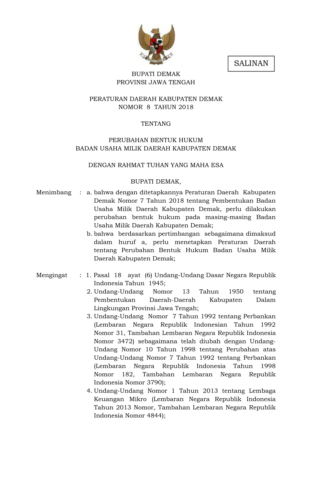 PERDA Nomor 8 Tahun 2018 | Peraturan Daerah Nomor 8 Tahun 2018 tentang Perubahan Bentuk Hukum Badan Usaha Milik Daerah Kabupaten Demak