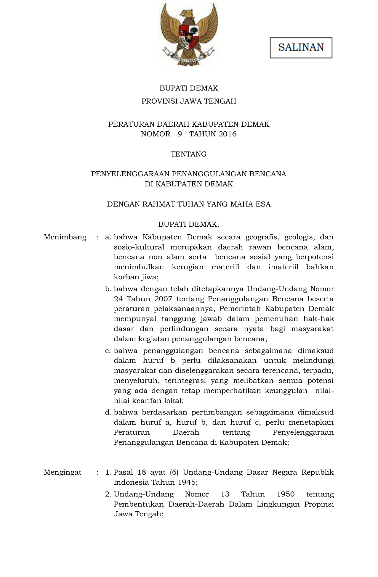 PERDA Nomor 9 Tahun 2016 | Peraturan Daerah Nomor 9 Tahun 2016 tentang Penyelenggaraan Penanggulangan Bencana di Kabupaten Demak