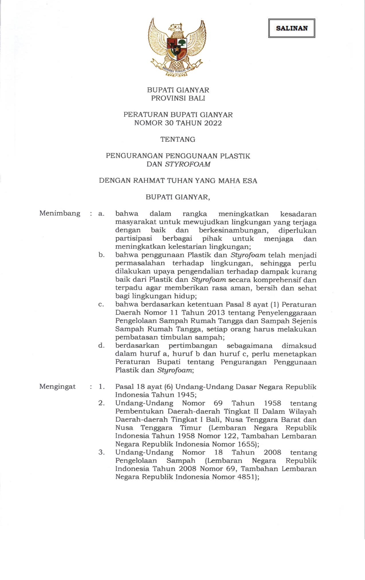 PERDA Nomor 30 Tahun 2022 | Peraturan Daerah Nomor 30 Tahun 2022 tentang PERATURAN BUPATI GIANYAR NOMOR 30 TAHUN 2022 TENTANG PENGURANGAN PENGGUNAAN PLASTIK DAN STYROFOAM