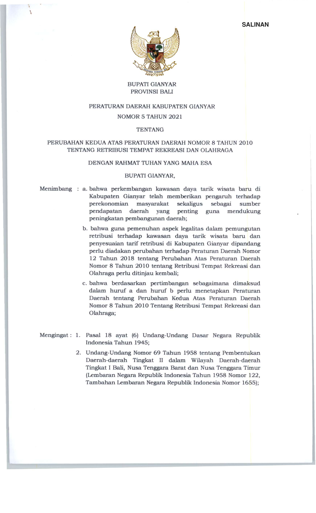 PERDA Nomor 5 Tahun 2021 | Peraturan Daerah Nomor 5 Tahun 2021 tentang PERUBAHAN KEDUA ATAS PERATURAN DAERAH NOMOR 8 TAHUN 2010TENTANG RETRIBUSI TEMPAT REKREAS I DAN OLAHRAGA