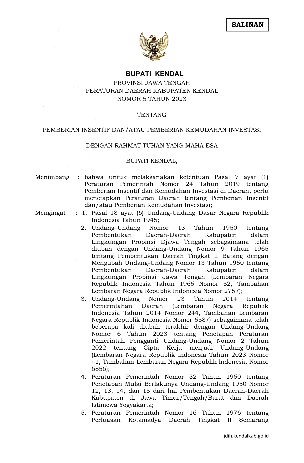 jdih.kendalkab.go.id Pemberian Kemudahan Investasi diatur dalam Peraturan Bupati.