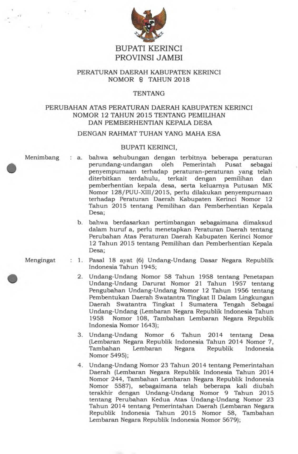PERDA Nomor 8 Tahun 2018 | Peraturan Daerah Nomor 8 Tahun 2018 tentang Peraturan Daerah Nomor 8 Tahun 2018 Tentang PERUBAHAN ATAS PERATURAN DAERAH KABUPATEN KERINCI NOMOR 12 TAHUN 2015 TENTANG PEMILIHAN DAN PEMBERHENTIAN KEPALA DESA