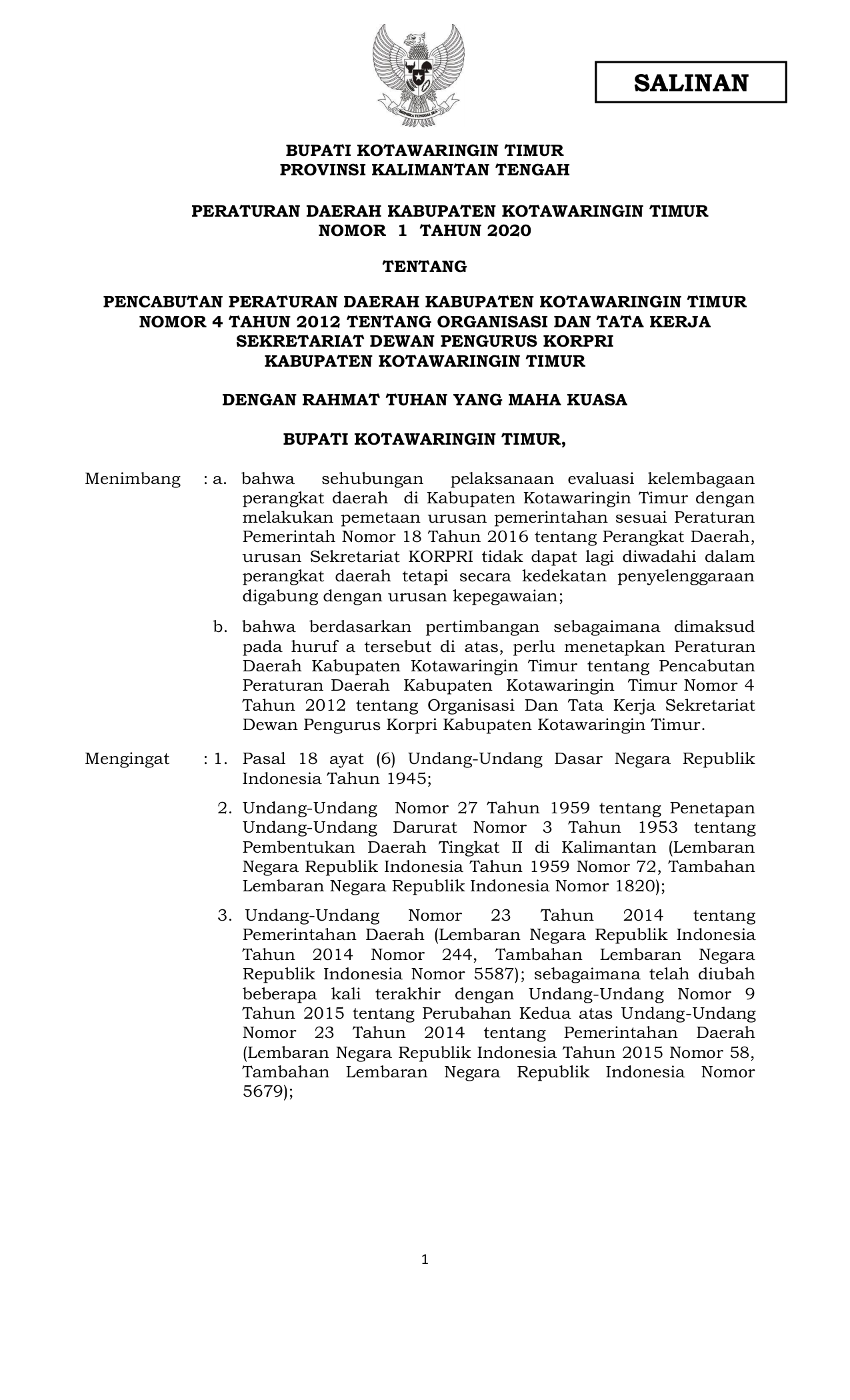 PERDA Nomor 1 Tahun 2020 | Peraturan Daerah Nomor 1 Tahun 2020 tentang Peraturan Daerah Nomor 1 Tahun 2020 tentang Pencabutan Peraturan Daerah Kabupaten Kotawaringin Timur Nomor 4 Tahun 2012 tentang Organisasi Dan Tata Kerja Sekretariat Dewan Pengurus Korpri Kabupaten Kotawaringin Timur