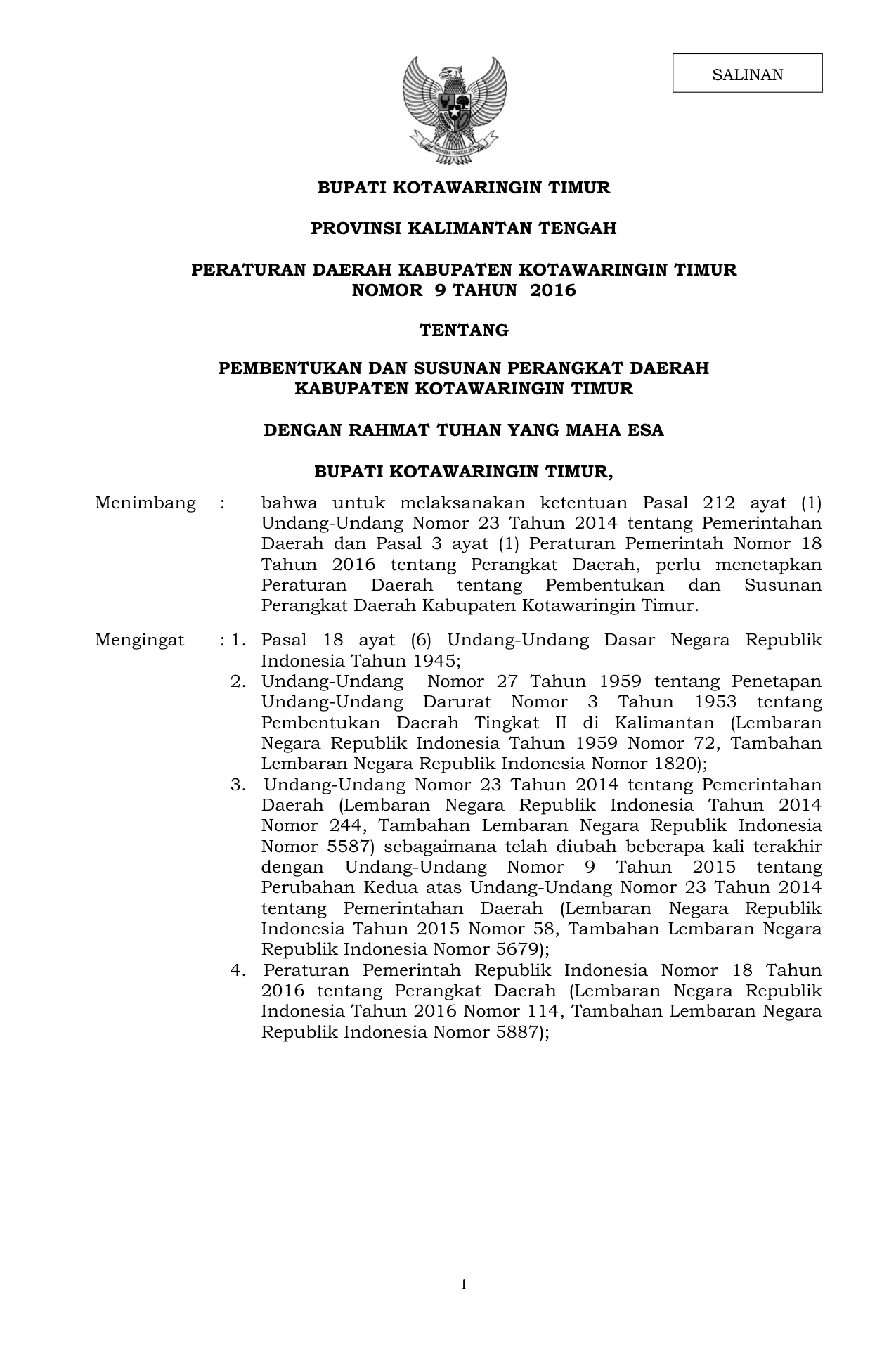 PERDA Nomor 9 Tahun 2016 | Peraturan Daerah Nomor 9 Tahun 2016 tentang Peraturan Daerah Nomor 9 Tahun 2016 tentang Pembentukan Dan Susunan Perangkat Daerah Kabupaten Kotawaringin Timur