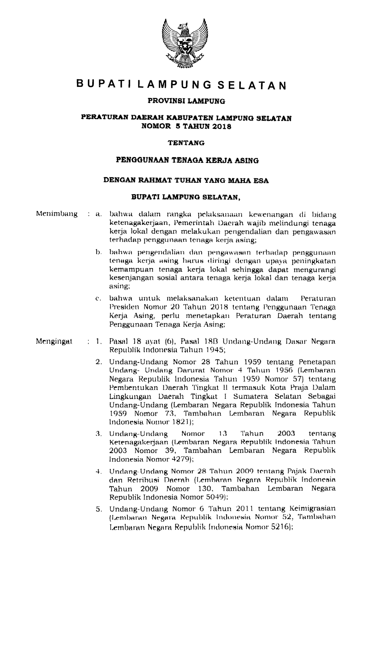 PERDA Nomor 5 Tahun 2018 | Peraturan Daerah Nomor 5 Tahun 2018 tentang Provinsi Lampung Peraturan Daerah Kabupaten Lampung Selatan Nomor 5 Tahun 2018 Tentang Penggunaan Tenaga Kerja Asing