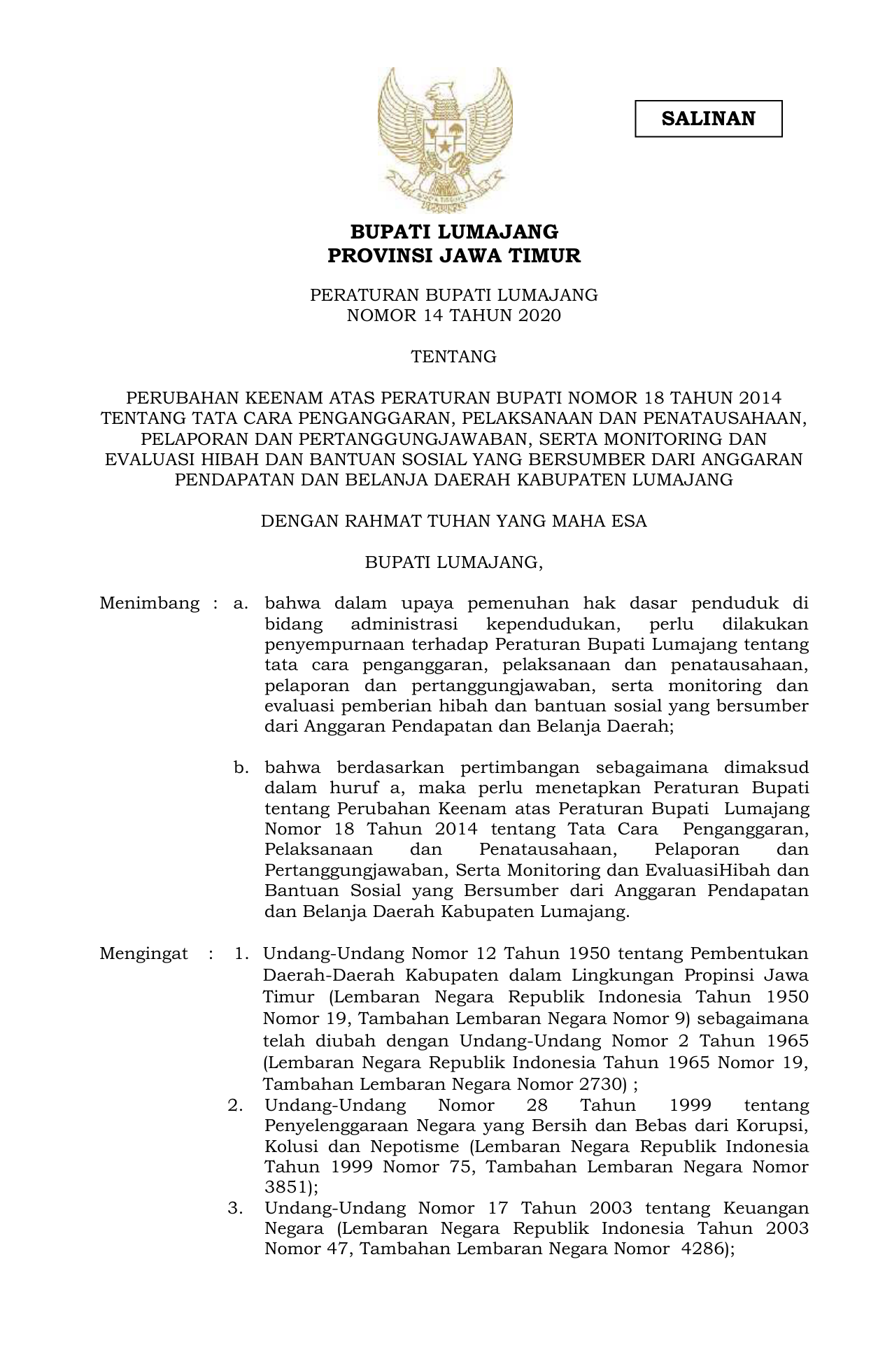 PERDA Nomor 14 Tahun 2020 | Peraturan Daerah Nomor 14 Tahun 2020 tentang PERUBAHAN KEENAM ATAS PERATURAN BUPATI NOMOR 18 TAHUN 2014TENTANG TATA CARA PENGANGGARAN, PELAKSANAAN DAN PENATAUSAHAAN,PELAPORAN DAN PERTANGGUNGJAWABAN, SERTA MONITORING DANEVALUASI HIBAH DAN BANTUAN SOSIAL YANG BERSUMBER DARI ANGGARANPENDAPATAN DAN BELANJA DAERAH KABUPATEN LUMAJANG