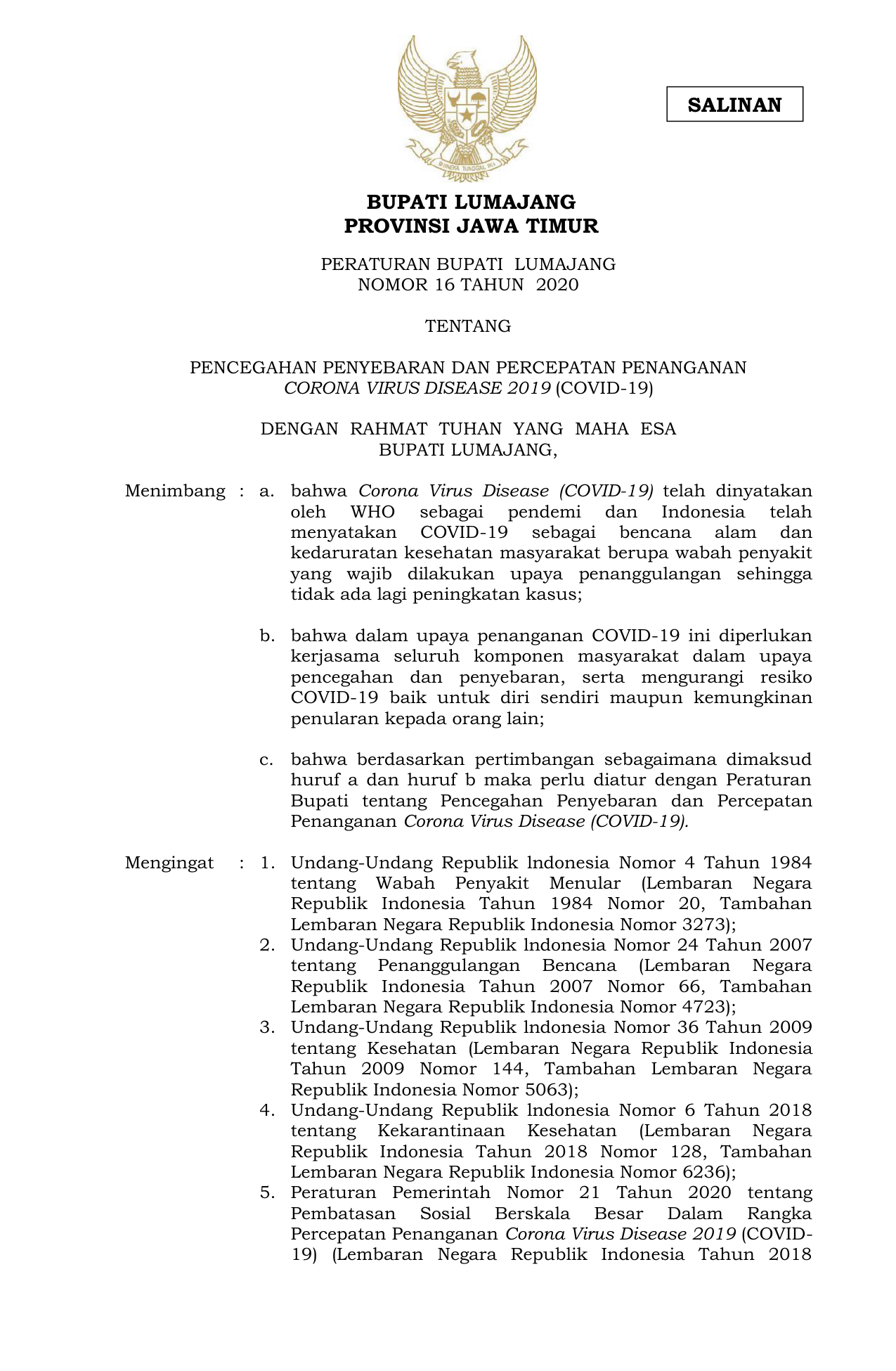 PERDA Nomor 16 Tahun 2020 | Peraturan Daerah Nomor 16 Tahun 2020 tentang PENCEGAHAN PENYEBARAN DAN PERCEPATAN PENANGANANCORONA VIRUS DISEASE 2019 (COVID-19)