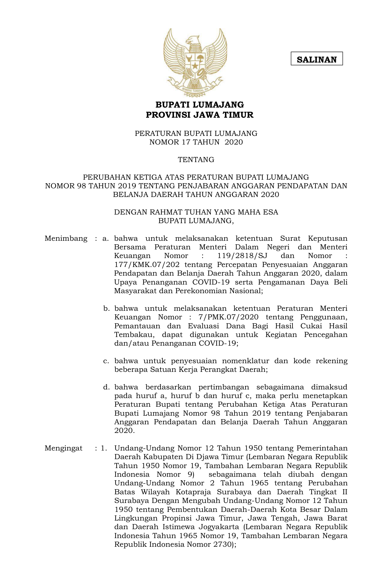 PERDA Nomor 17 Tahun 2020 | Peraturan Daerah Nomor 17 Tahun 2020 tentang PERUBAHAN KETIGA ATAS PERATURAN BUPATI LUMAJANGNOMOR 98 TAHUN 2019 TENTANG PENJABARAN ANGGARAN PENDAPATAN DANBELANJA DAERAH TAHUN ANGGARAN 2020