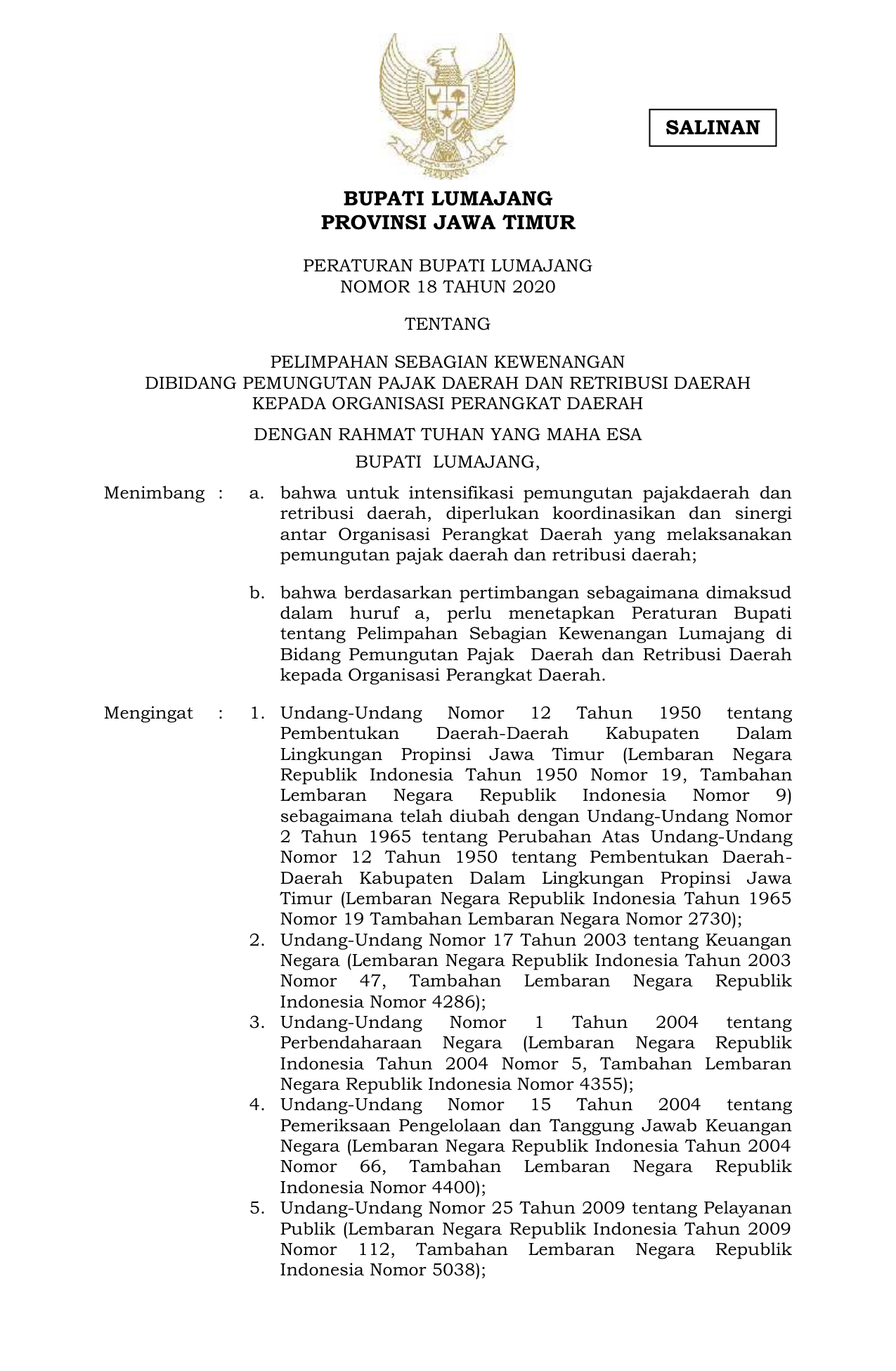PERDA Nomor 18 Tahun 2020 | Peraturan Daerah Nomor 18 Tahun 2020 tentang PELIMPAHAN SEBAGIAN KEWENANGANDIBIDANG PEMUNGUTAN PAJAK DAERAH DAN RETRIBUSI DAERAHKEPADA ORGANISASI PERANGKAT DAERAH