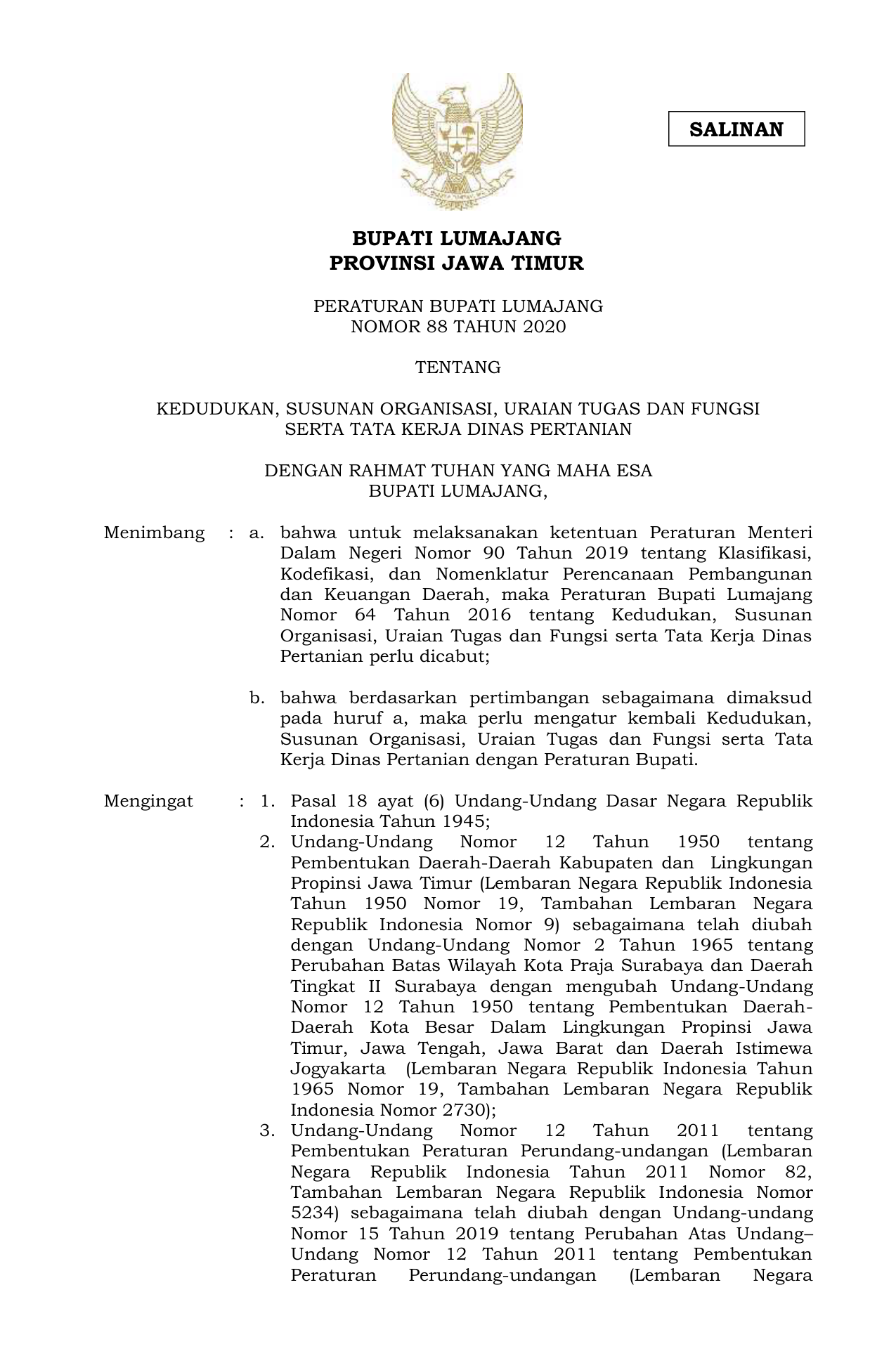 PERDA Nomor 88 Tahun 2020 | Peraturan Daerah Nomor 88 Tahun 2020 tentang KEDUDUKAN, SUSUNAN ORGANISASI, URAIAN TUGAS DAN FUNGSISERTA TATA KERJA DINAS PERTANIAN