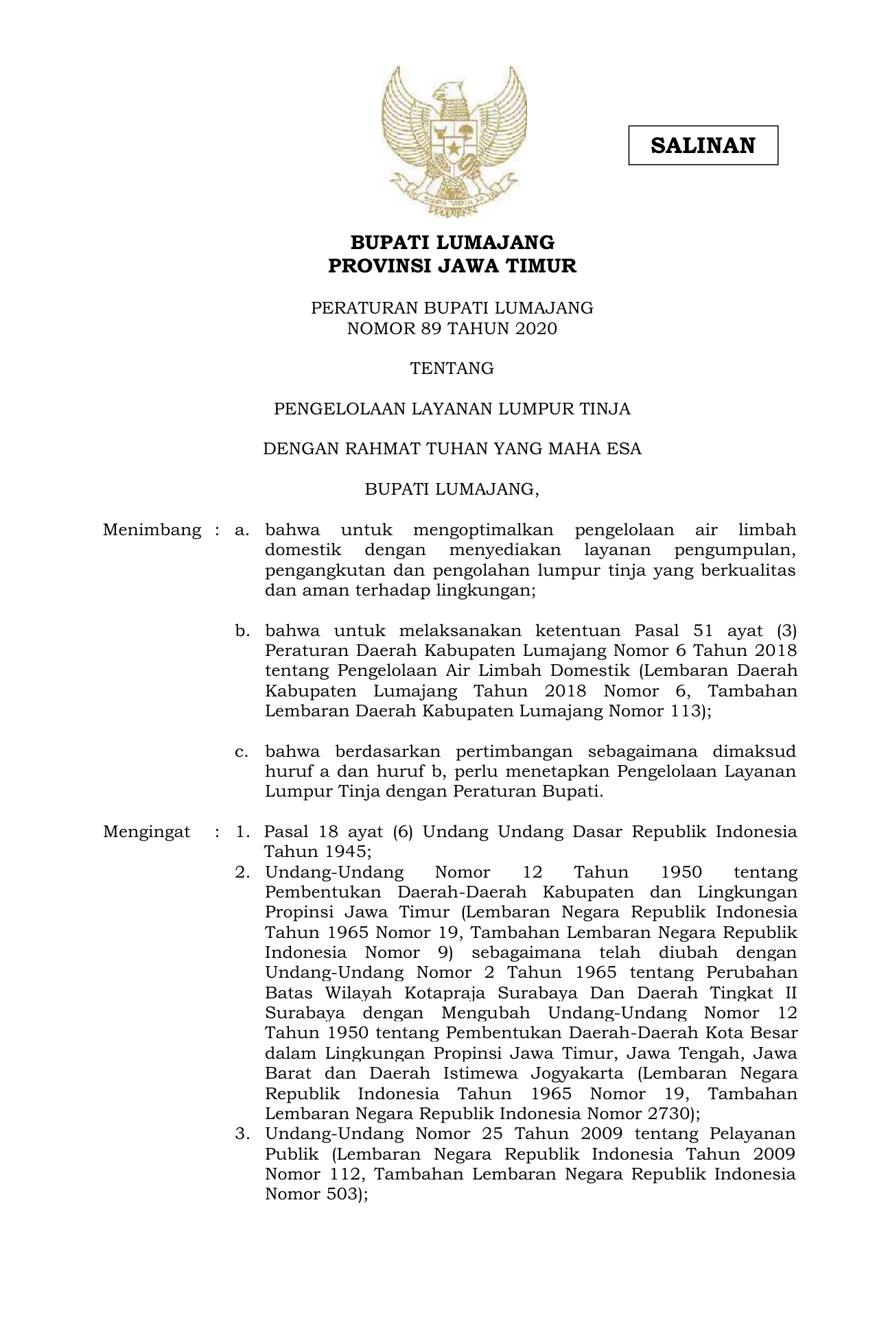 PERDA Nomor 89 Tahun 2020 | Peraturan Daerah Nomor 89 Tahun 2020 tentang PENGELOLAAN LAYANAN LUMPUR TINJA