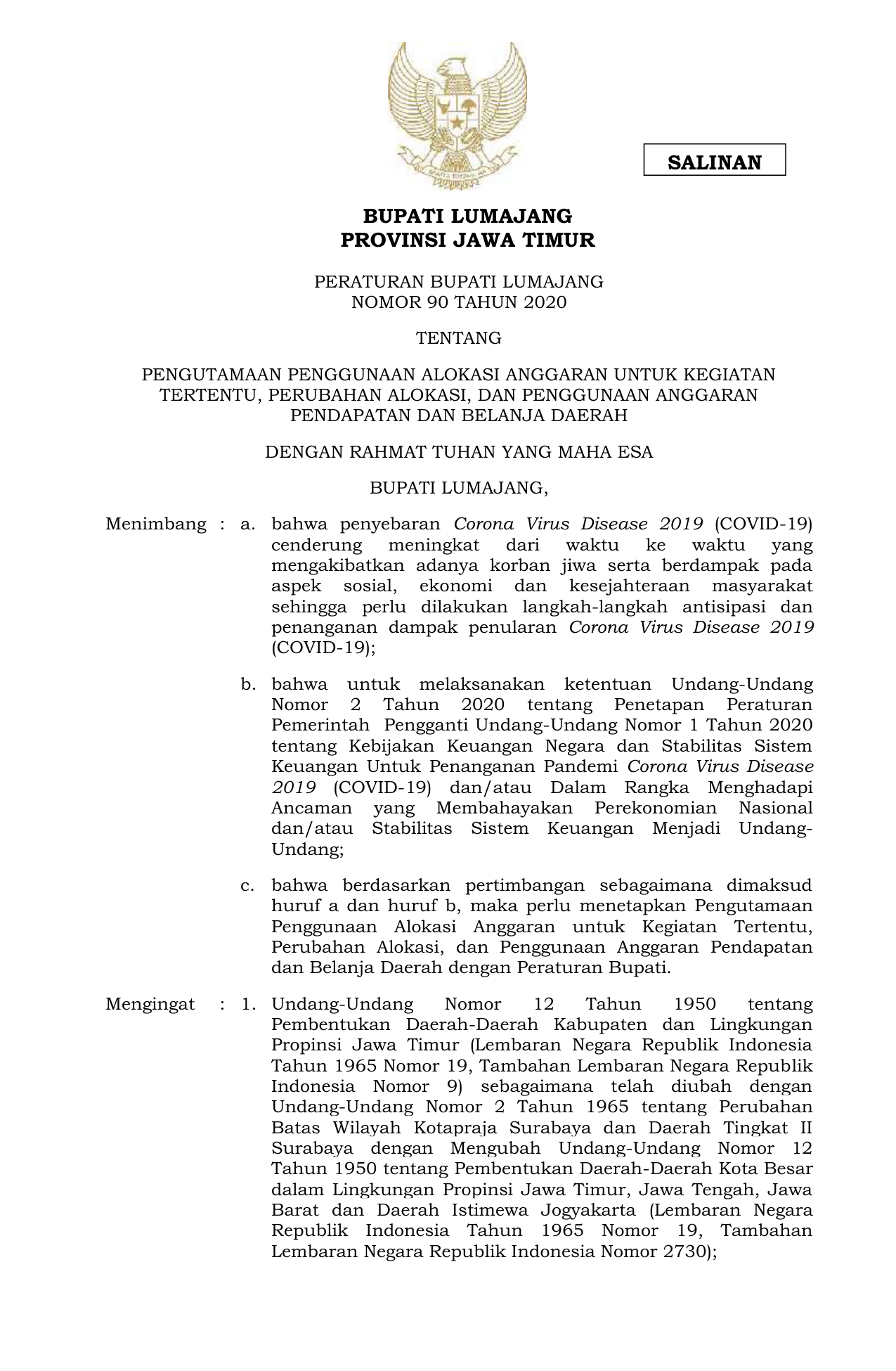 PERDA Nomor 90 Tahun 2020 | Peraturan Daerah Nomor 90 Tahun 2020 tentang PENGUTAMAAN PENGGUNAAN ALOKASI ANGGARAN UNTUK KEGIATANTERTENTU, PERUBAHAN ALOKASI, DAN PENGGUNAAN ANGGARANPENDAPATAN DAN BELANJA DAERAH