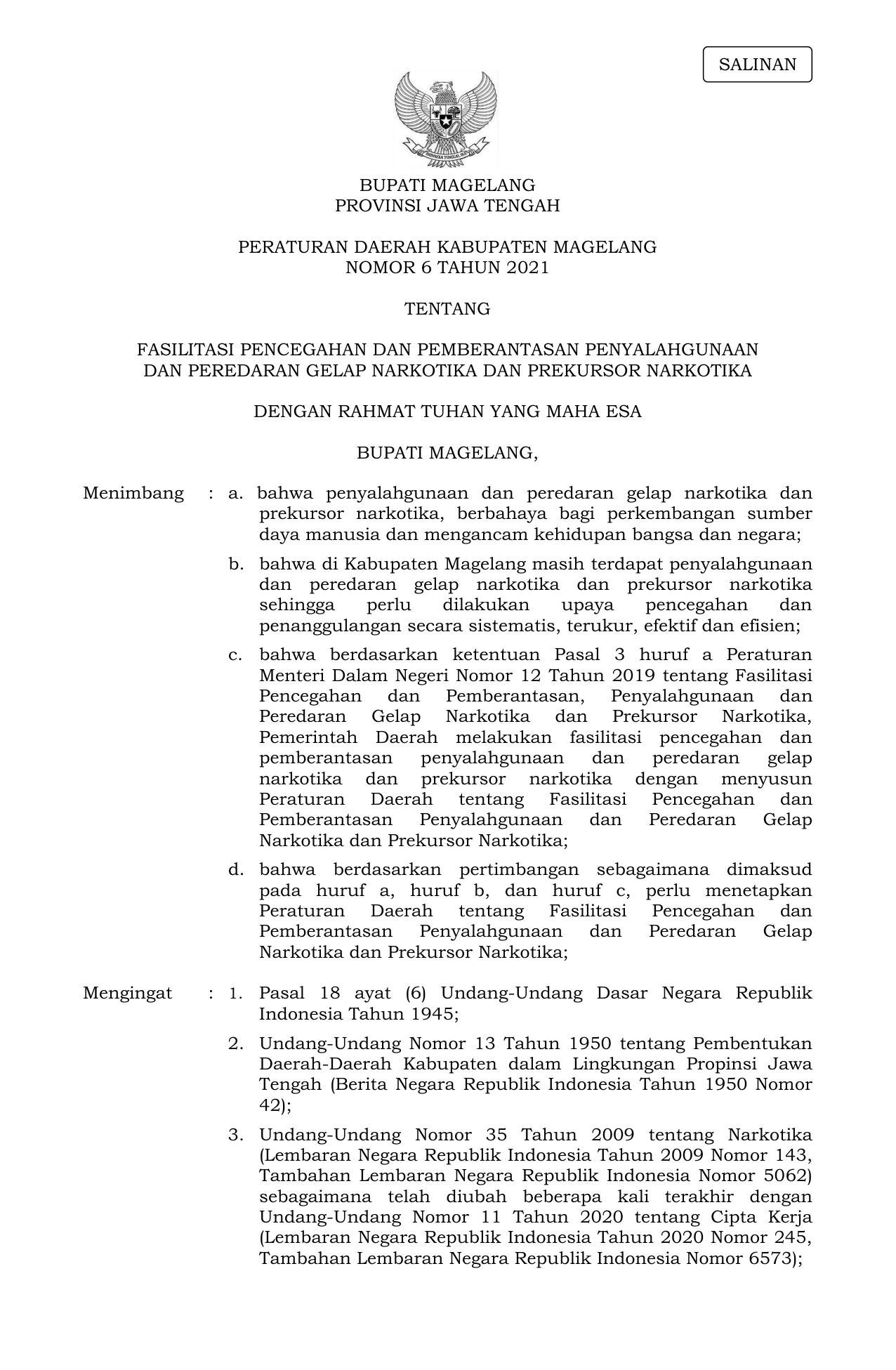 PERDA Nomor 6 Tahun 2021 | Peraturan Daerah Nomor 6 Tahun 2021 tentang FASILITASI PENCEGAHAN DAN PEMBERANTASAN PENYALAHGUNAAN DAN PEREDARAN GELAP NARKOTIKA DAN PREKURSOR NARKOTIKA