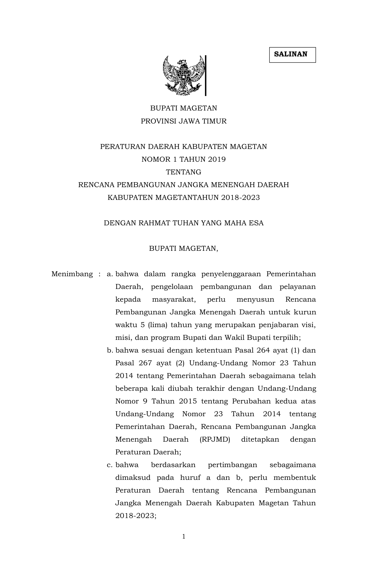 PERDA Nomor 1 Tahun 2019 | Peraturan Daerah Nomor 1 Tahun 2019 tentang Peraturan Daerah (PERDA) tentang Rencana Pembangunan Jangka Menengah Daerah Kabupaten Magetan Tahun 2018-2023