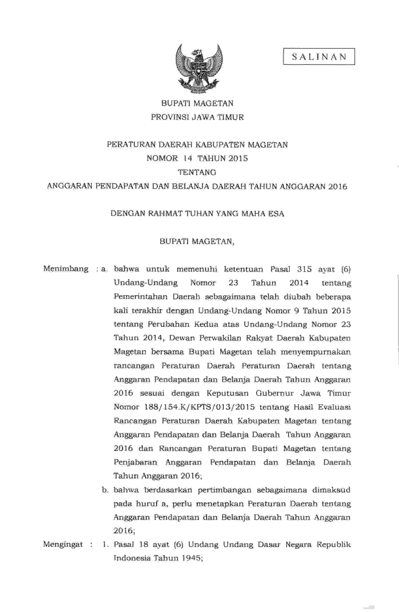 PERDA Nomor 14 Tahun 2015 | Peraturan Daerah Nomor 14 Tahun 2015 tentang Peraturan Daerah (PERDA) tentang Anggaran Pendapatan Dan Belanja Daerah Tahun Anggaran 2016