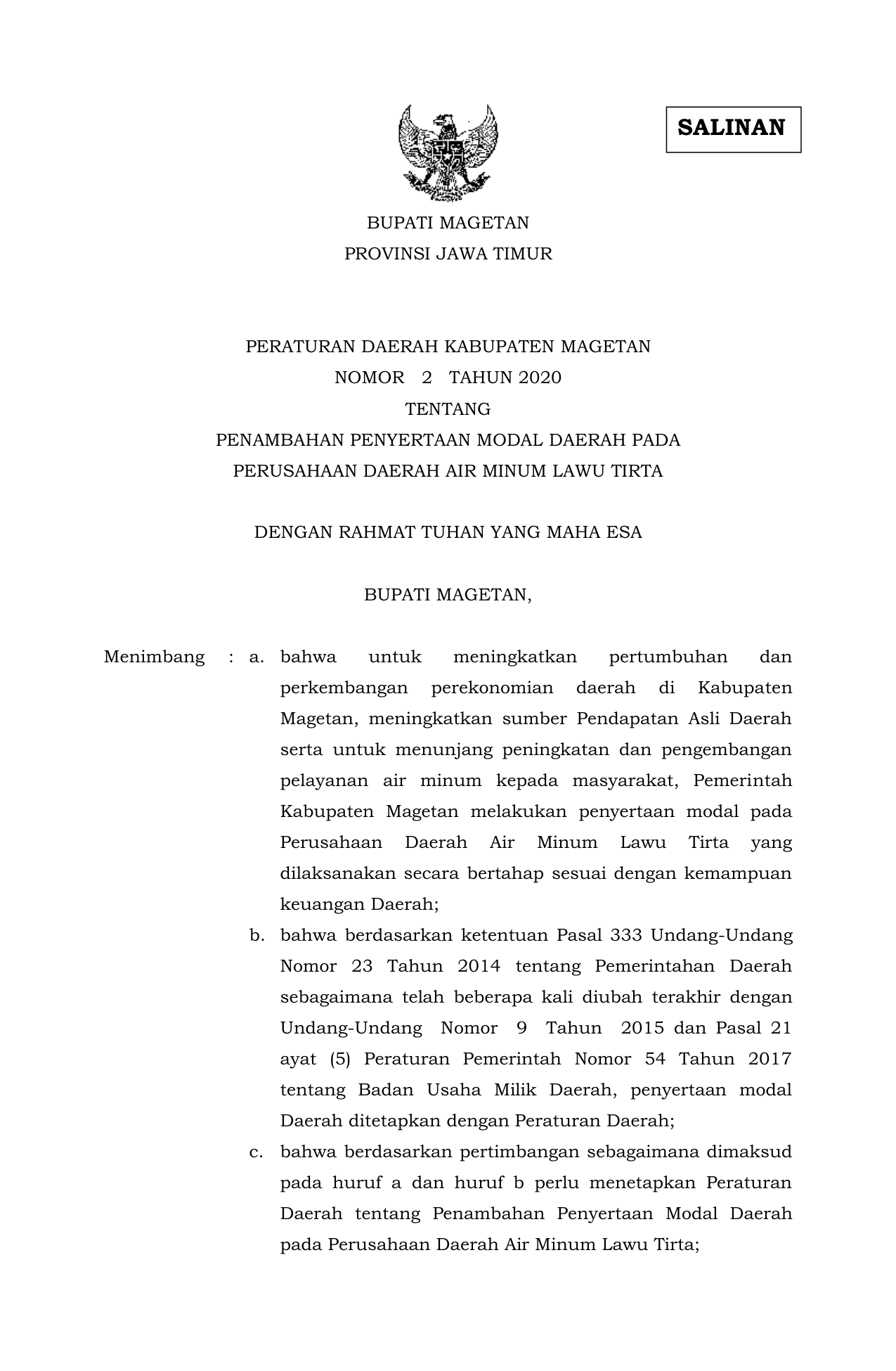 PERDA Nomor 2 Tahun 2020 | Peraturan Daerah Nomor 2 Tahun 2020 tentang Peraturan Daerah (PERDA) tentang PENAMBAHAN PENYERTAAN MODAL DAERAH PADA PERUSAHAAN DAERAH AIR MINUM LAWU TIRTA