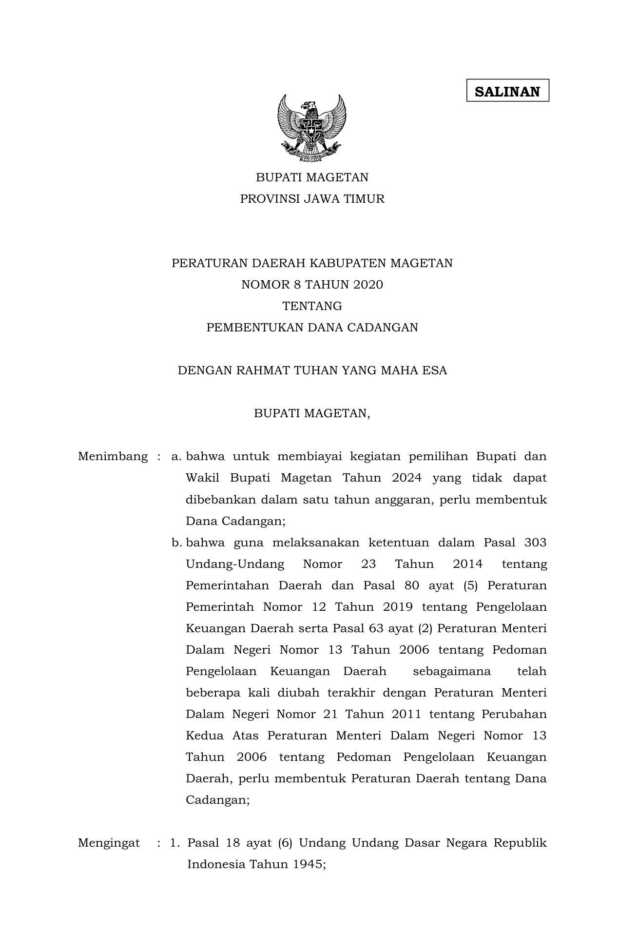 LEMBARAN DAERAH KABUPATEN MAGETAN TAHUN 2020 NOMOR 8