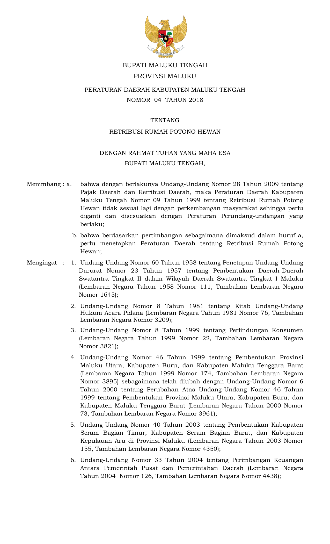 PERDA Nomor 4 Tahun 2018 | Peraturan Daerah Nomor 4 Tahun 2018 tentang PERATURAN DAERAH KABUPATEN MALUKU TENGAH NOMOR 4 TAHUN 2018 TENTANG RETRIBUSI RUMAH POTONG HEWAN