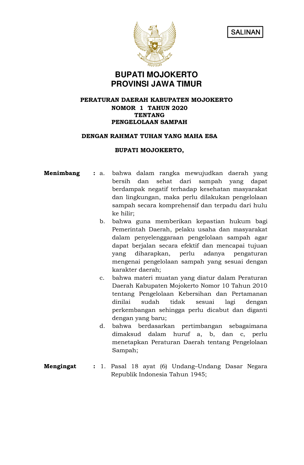 PERDA Nomor 1 Tahun 2020 | Peraturan Daerah Nomor 1 Tahun 2020 tentang PENGELOLAAN SAMPAH