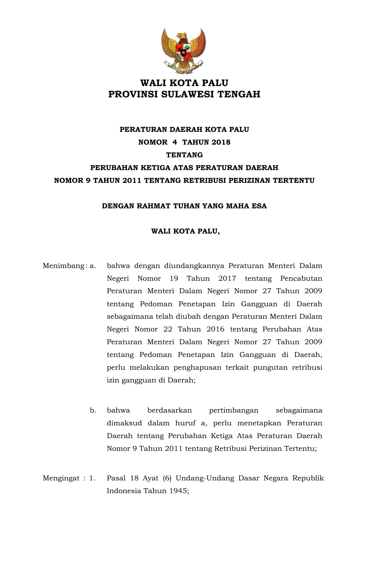 PERDA Nomor 4 Tahun 2018 | Peraturan Daerah Nomor 4 Tahun 2018 tentang PERUBAHAN KETIGA ATAS PERATURAN DAERAH NOMOR 9 TAHUN 2011 TENTANG RETRIBUSI PERIZINAN TERTENTU