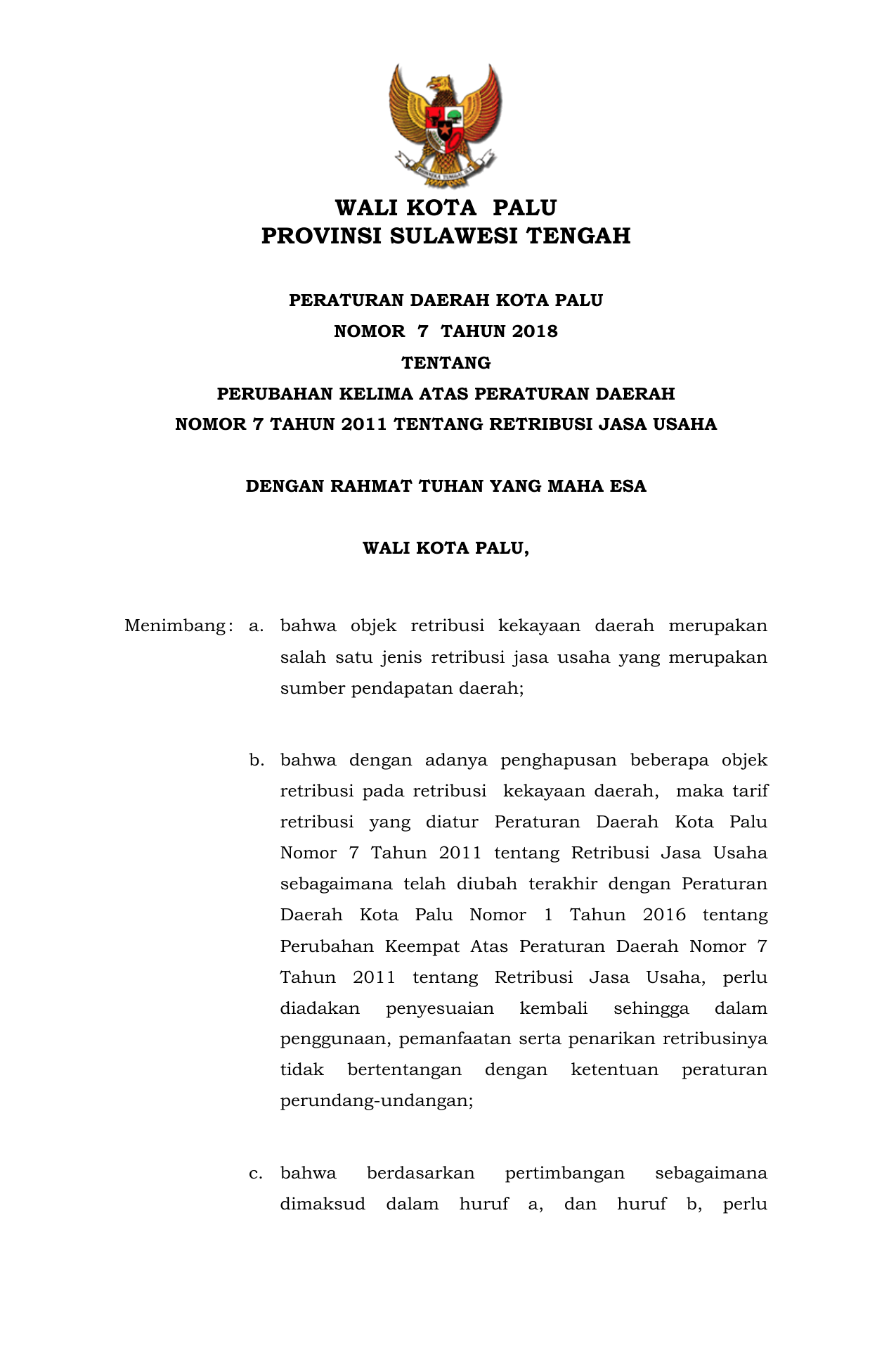 Peraturan Daerah Kota Palu Nomor 7 Tahun 2011 tentang Retribusi Jasa Usaha (Lembaran Daerah Kota Palu Tahun 2011 Nomor 7, Tambahan Lembaran Daerah Kota Palu Nomor 5) yang telah beberapa kali diubah dengan Peraturan Daerah: