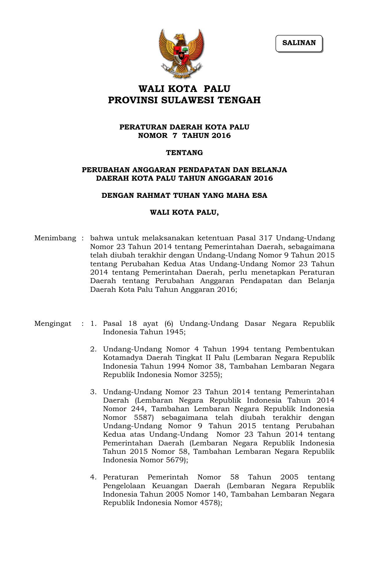 PERDA Nomor 77 Tahun 2016 | Peraturan Daerah Nomor 77 Tahun 2016 tentang Perubahan Anggaran Pendapatan dan Belanja Daerah Kota Palu Tahun Anggaran 2016