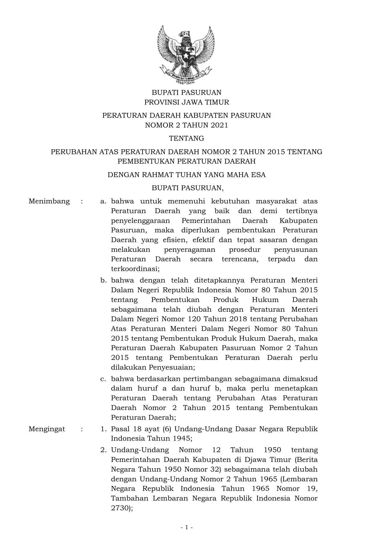 PERDA Nomor 2 Tahun 2021 | Peraturan Daerah Nomor 2 Tahun 2021 tentang PERUBAHAN ATAS PERATURAN DAERAH NOMOR 2 TAHUN 2015 TENTANG PEMBENTUKAN PERATURAN DAERAH