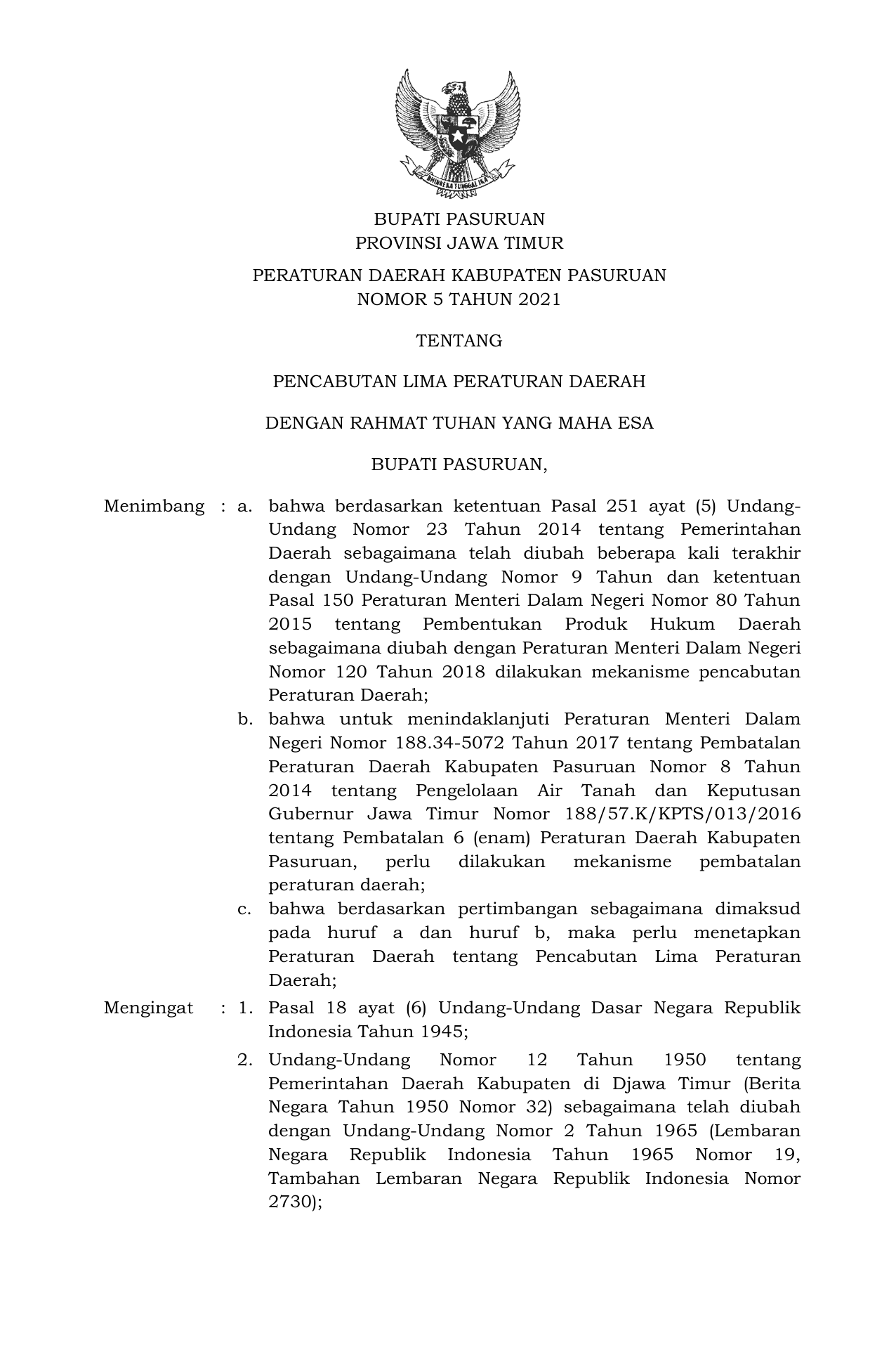PERDA Nomor 5 Tahun 2021 | Peraturan Daerah Nomor 5 Tahun 2021 tentang PENCABUTAN LIMA PERATURAN DAERAH