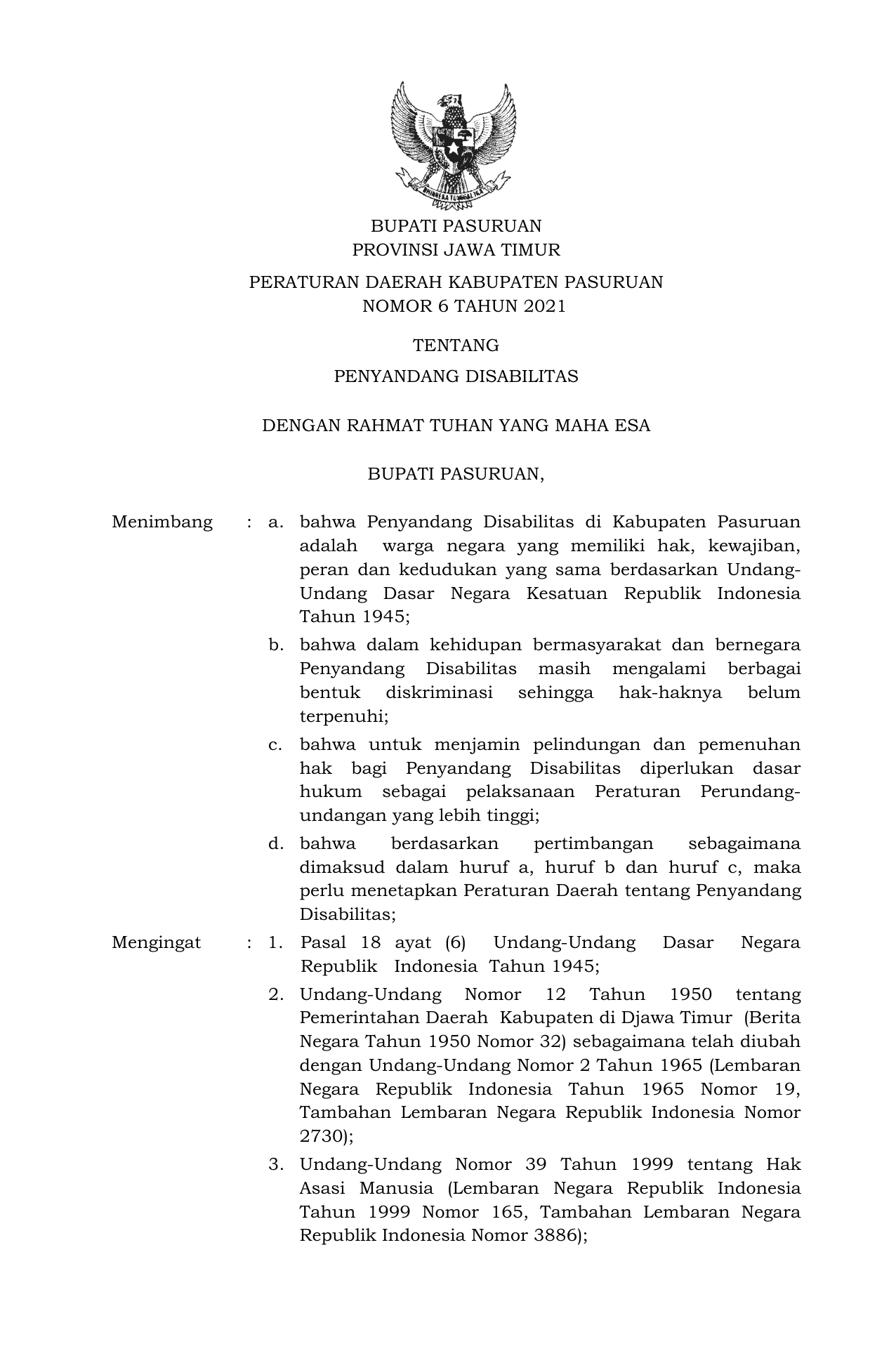 PERDA Nomor 6 Tahun 2021 | Peraturan Daerah Nomor 6 Tahun 2021 tentang PENYANDANG DISABILITAS