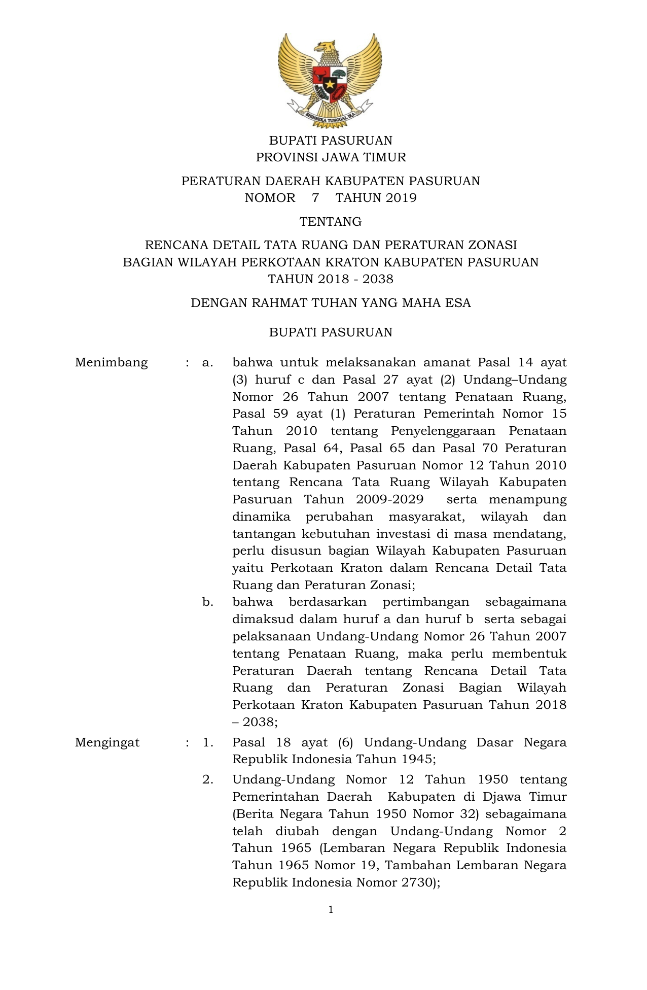 PERDA Nomor 7 Tahun 2019 | Peraturan Daerah Nomor 7 Tahun 2019 tentang RENCANA DETAIL TATA RUANG DAN PERATURAN ZONASIBAGIAN WILAYAH PERKOTAAN KRATON KABUPATEN PASURUANTAHUN 2018 - 2038