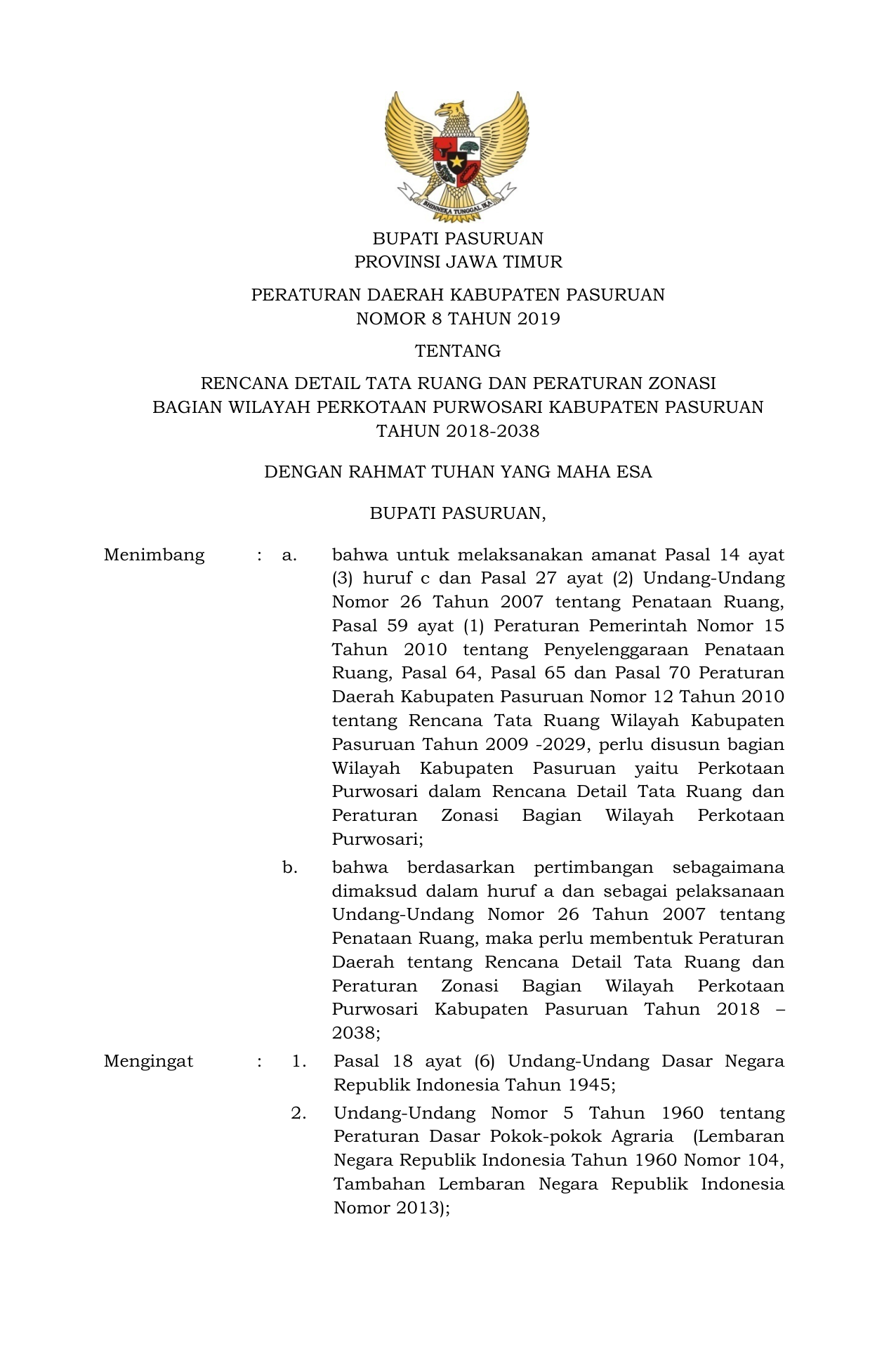 PERDA Nomor 8 Tahun 2019 | Peraturan Daerah Nomor 8 Tahun 2019 tentang RENCANA DETAIL TATA RUANG DAN PERATURAN ZONASI BAGIAN WILAYAH PERKOTAAN PURWOSARI KABUPATEN PASURUAN TAHUN 2018-2038