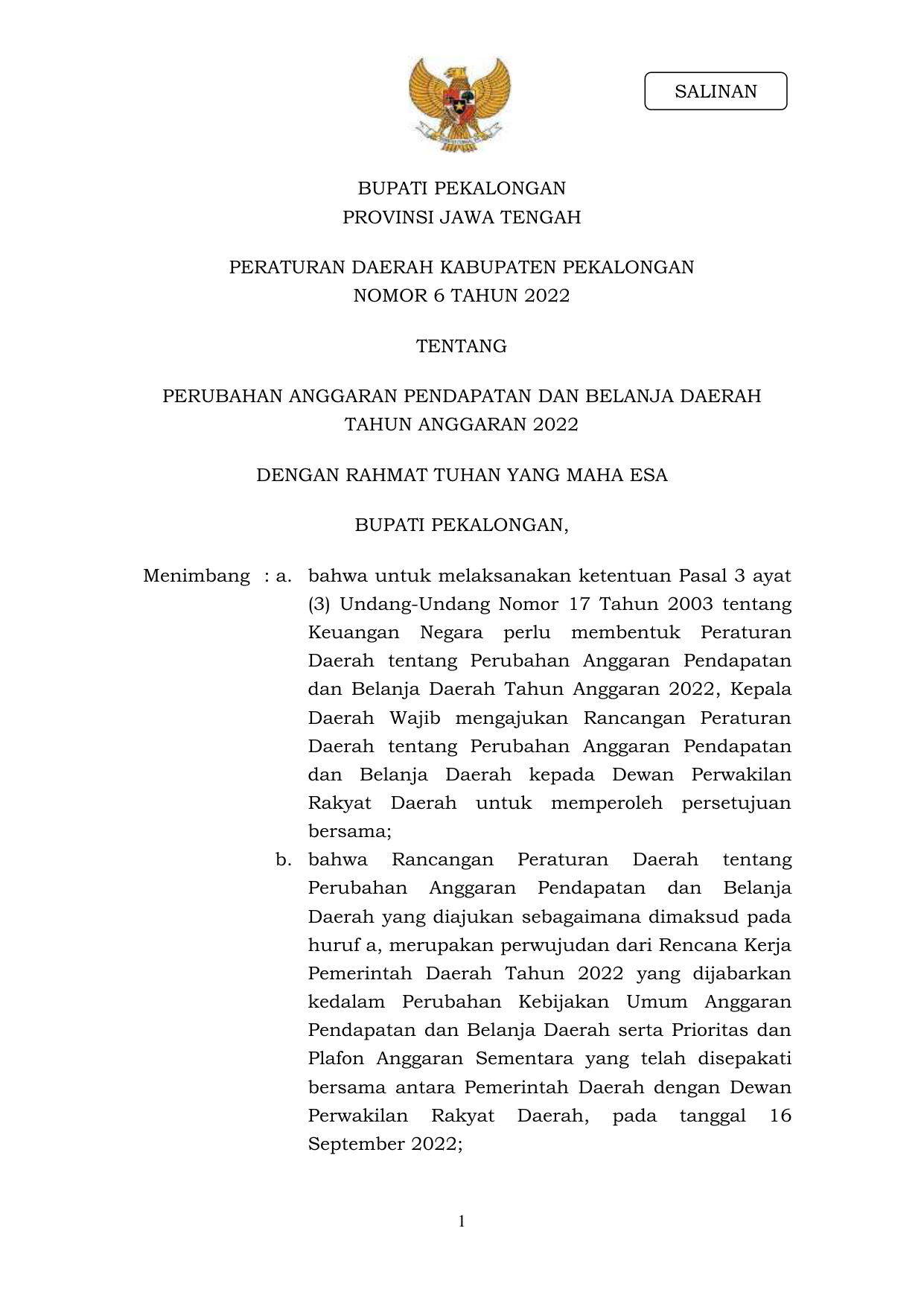 PERDA Nomor 6 Tahun 2022 | Peraturan Daerah Nomor 6 Tahun 2022 tentang PERUBAHAN ANGGARAN PENDAPATAN DAN BELANJA DAERAH TAHUN ANGGARAN 2022