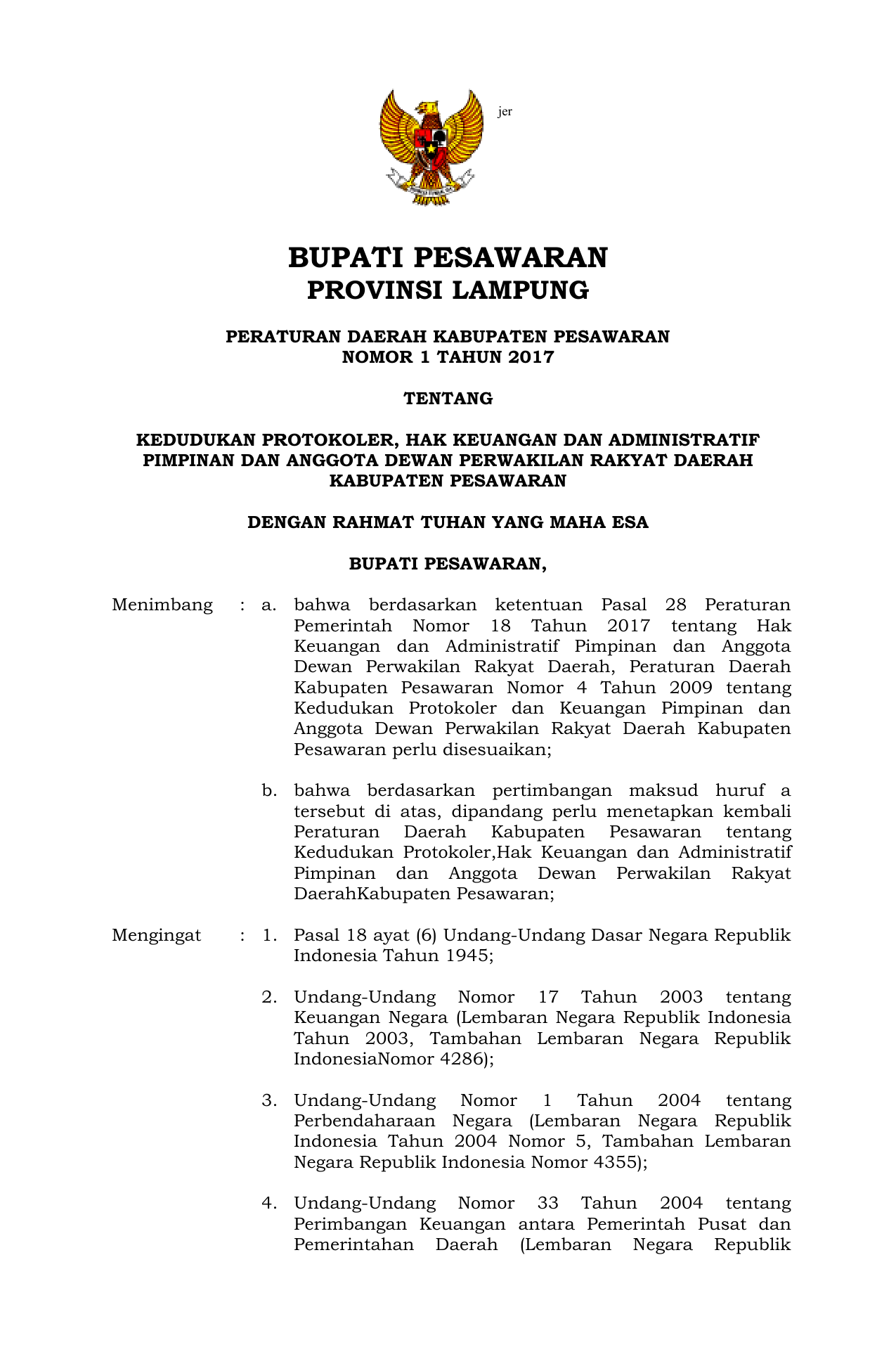 PERDA Nomor 1 Tahun 2017 | Peraturan Daerah Nomor 1 Tahun 2017 tentang Kedudukan Protokoler Hak keuangan Dan Administratif Piminan Dan Anggota Dewan pewakilan Rakyat Daerah Kabupaten Pesawaran