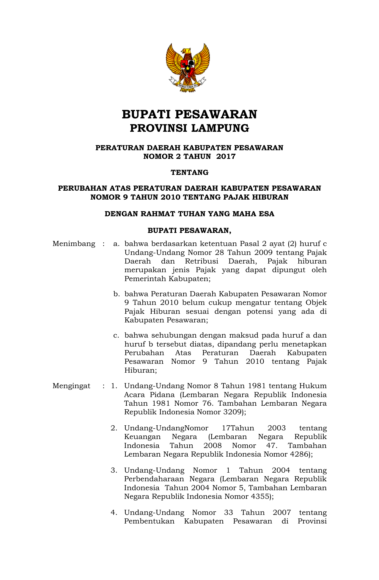 PERDA Nomor 2 Tahun 2017 | Peraturan Daerah Nomor 2 Tahun 2017 tentang Perubahan Atas Peraturan Daerah kabupaten Pesawaran Nomor 9 tahun 2010 Tentang Pajak hiburan