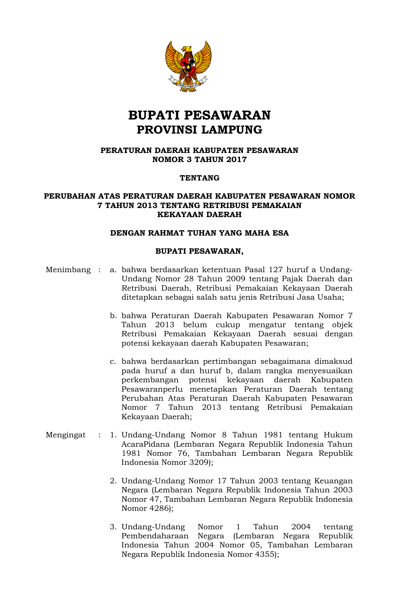 PERDA Nomor 3 Tahun 2017 | Peraturan Daerah Nomor 3 Tahun 2017 tentang Perubahan Atas peraturan Daerah Kabupaten Pesawaran nomor 7 Tahun 2013 tentang Retribusi Pemakain