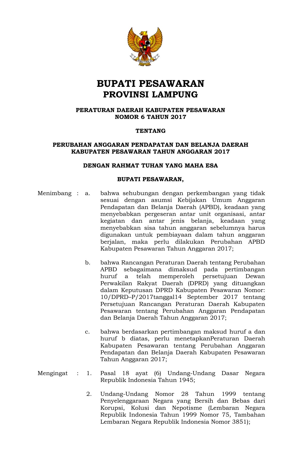 PERDA Nomor 6 Tahun 2017 | Peraturan Daerah Nomor 6 Tahun 2017 tentang Perubahan Anggaran Pendapatan dan belanja Daerah Kabupaten Pesawaran Tahun Anggaran 2017