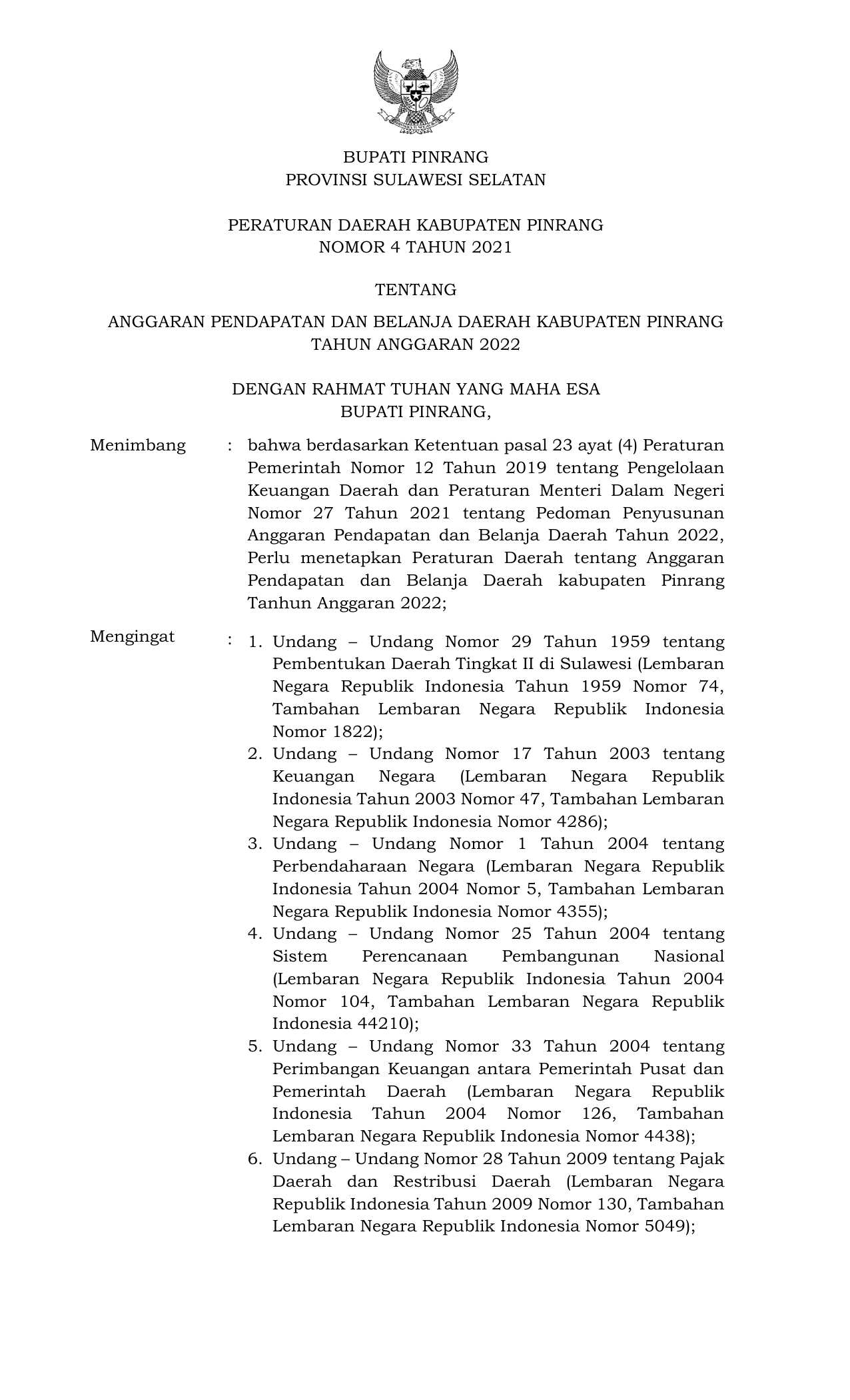PERDA Nomor 4 Tahun 2021 | Peraturan Daerah Nomor 4 Tahun 2021 tentang ANGGARAN PENDAPATAN DAN BELANJA DAERAH KABUPATEN PINRANG TAHUN ANGGARAN 2022