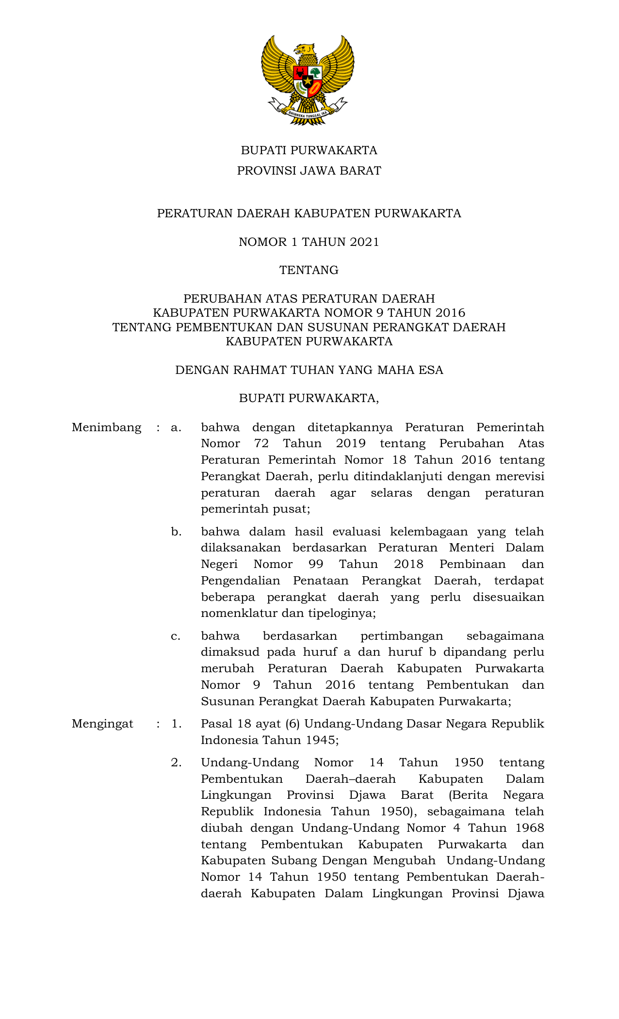PERDA Nomor 1 Tahun 2021 | Peraturan Daerah Nomor 1 Tahun 2021 tentang PERUBAHAN ATAS PERATURAN DAERAHKABUPATEN PURWAKARTA NOMOR 9 TAHUN 2016TENTANG PEMBENTUKAN DAN SUSUNAN PERANGKAT DAERAHKABUPATEN PURWAKARTA