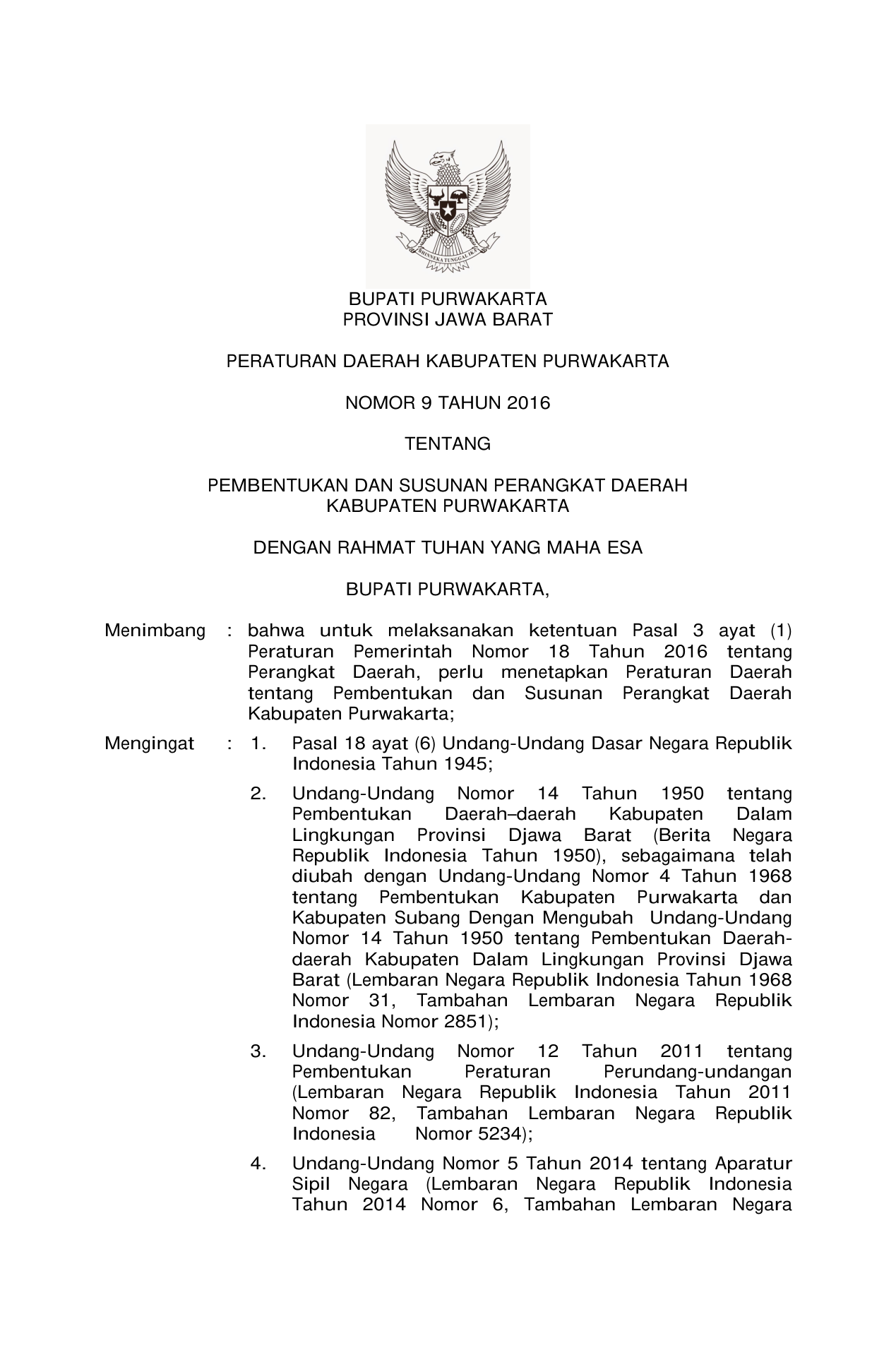 PERDA Nomor 9 Tahun 2016 | Peraturan Daerah Nomor 9 Tahun 2016 tentang PEMBENTUKAN DAN SUSUNAN PERANGKAT DAERAHKABUPATEN PURWAKARTA