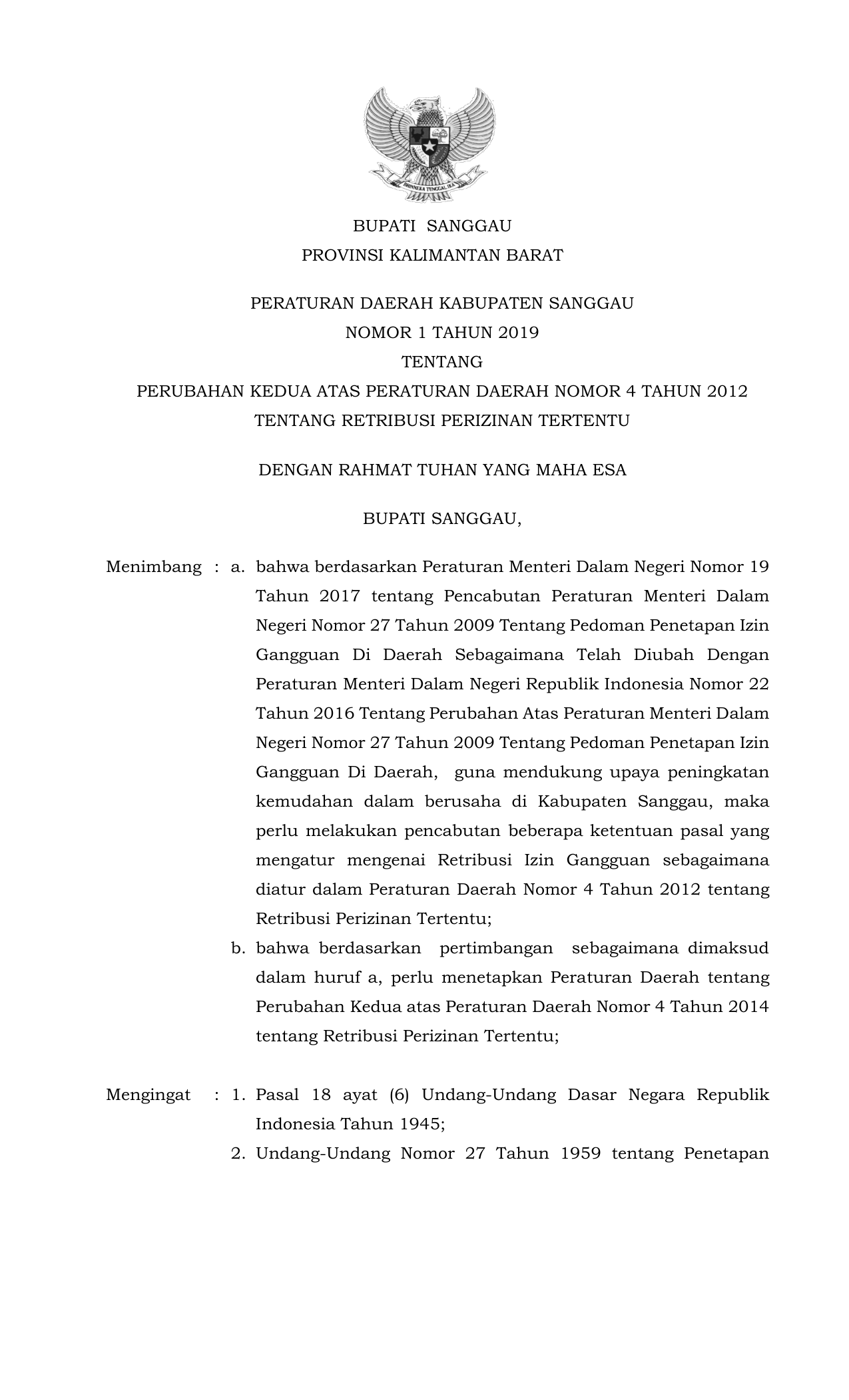 PERDA Nomor 1 Tahun 2019 | Peraturan Daerah Nomor 1 Tahun 2019 tentang PERUBAHAN KEDUA ATAS PERATURAN DAERAH NOMOR 4 TAHUN 2012 TENTANG RETRIBUSI PERIZINAN TERTENTU